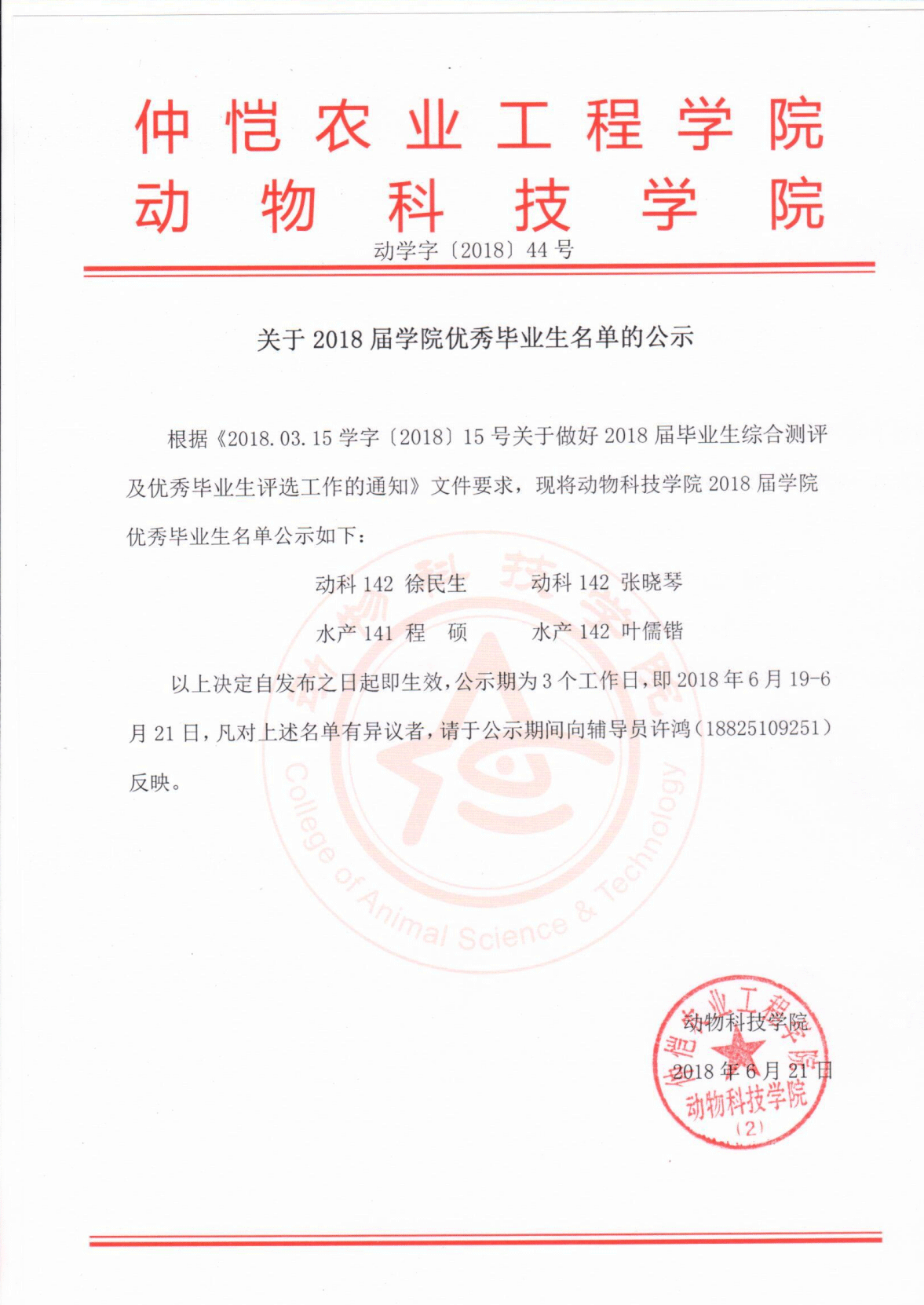 关于2018届学院优秀毕业生名单的公示