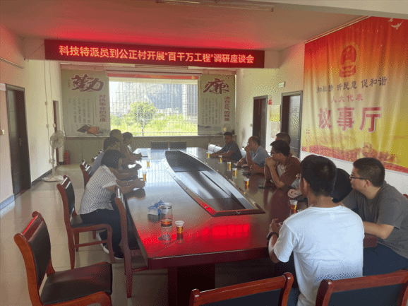 下午,特派员团队抵达位于黄花镇中心的公正村,这里是英西峰林的核心区域,乡村民宿业发展势头强劲。在与村干部的座谈中,公正村村支书陈子牙分享了村内经济结构和产业状况,以及在推进“百千万工程”建设过程中遇到的问题和困难。特派员团队深入分析了水产养殖过程中出现的问题,并结合民宿的特色产业的发展提供了切实可行的规划建议。