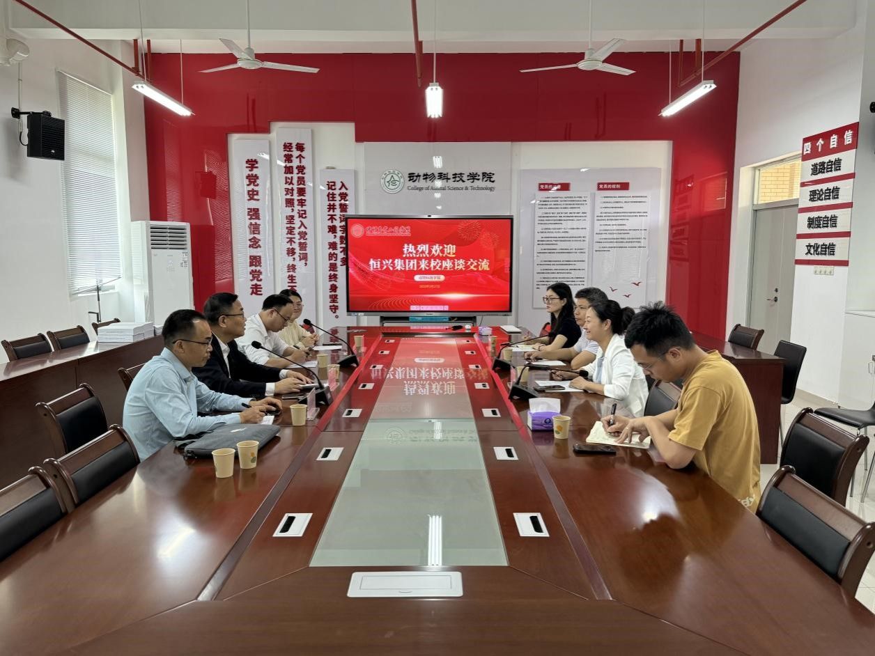 为深化产教融合、推动应用型行业人才培养模式创新,推动人才培养体系与行业实践一线深度融合,3月27日,广东恒兴集团副总裁欧阳艳、广东恒兴生物科技有限公司副总经理王国华,广东恒兴研究院动保所副所长赵飞,人事副经理吴玉玲一行到访我院,与学院领导老师座谈交流,并为水产养殖专业本科毕业生带来职业规划专题讲座。