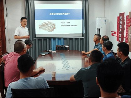 培训以“强化防灾意识、提升应对能力”为目标,紧扣南美白对虾在极端气候条件下的养殖风险与应急管理,围绕台风“前、中、后”阶段的池塘维护、水质调控、饲料管理、病害防控等方面,特别强调了台风前饲料控制与池水调蓄策略、台风期间的应急增氧与水质稳定措施、台风过后的病害预警与恢复管理技术。李江涛结合多年科研积累和技术实践,从行为生理学角度解析了台风天气对虾类应激反应的机制,提出“风前预防、风中稳控、风后修复”的系统性管理路径。吴跃华则围绕底质调理、水体净化及水质应急监测技术,为养殖户提供了具体可行的解决方案。在与养殖户代表的交流中,特派员团队针对近期台风天气下的池塘变化、水质波动、摄食异常等问题进行了解答。
