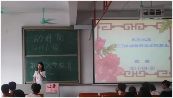 9月28日下午,国产激情在线在图书馆D512教室开展了2017级新生入学教育大会。辅导员沈洁从“理财”、“礼貌”、“理解”、“安全”四个方面强调了大学新生需要注意的事项。沈老师着重强调安全方面的问题,为同学们播放了“校园贷”、“电信诈骗”、“防传销”等方面的宣传视频,用生动的案例提醒同学们留意身边的各种安全隐患,保护好自己的人身安全。