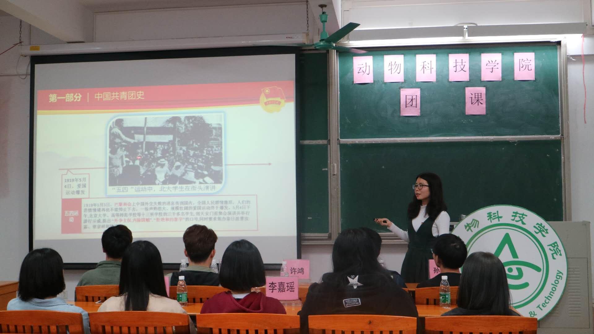 本次团课在高昂的团歌声中正式开始。团委副书记许鸿就中国共青团史、共青团团员义务和权利、 辉煌十九大,乡村振兴战略及勇于担当,做时代青年四方面展开。1957年,中国新民主主义青年团正式改为中国共产主义青年团。共青团是党的助手和后备军,并详细介绍中国共产党发展党员的流程及中国共青团团员的义务和权利。许鸿老师结合我校校训,对十九大中的意义、主题、八个明确以及未来战略分别进行讲解,并结合我校校长骆少明的话,认为动科院学子在未来会有更广阔的平台。她认为每个团员都应该成为一个能遵守团章以及校纪校规,勤奋学习,能起模范带头作用的有思想、有道德、有文化、有纪律的四有青年。