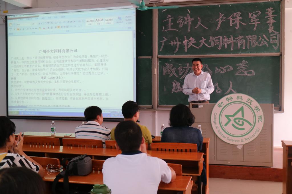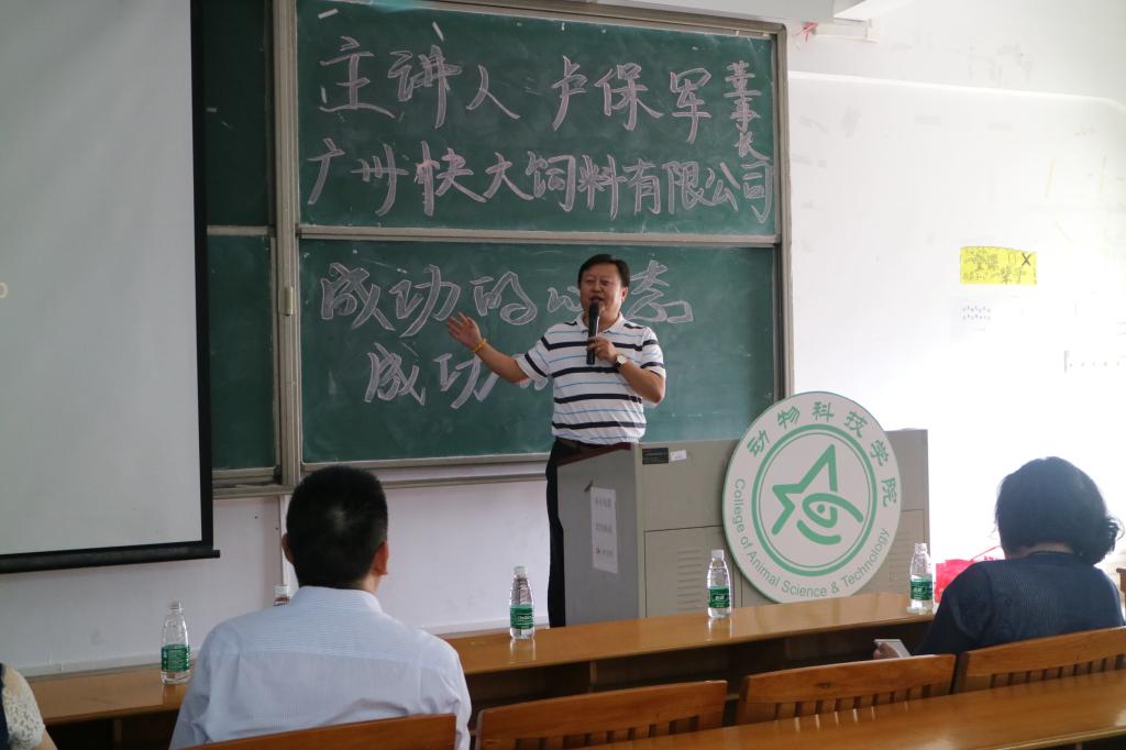 11月17日下午,国产激情在线“职面未来”系列讲座第八场在白云校区杨钊杨勋楼506室顺利举行。广州快大饲料有限公司董事长卢保军为大家作了“成功的心态,成功的人”主题讲座。广东省饲料行业协会副秘书长周洪、国产激情在线党总支书记曾献尼等出席本次讲座。