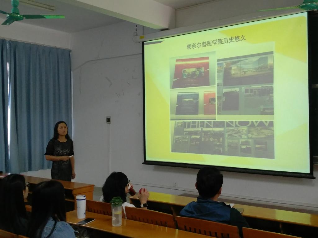 臧莹安首先介绍了康奈尔大学的概况,并对该校动物医学专业作了着重介绍,还讲述了自己在这座大学里的生活与研究经历。她给大家分享国内外大学的不同之处,提出“交流、讨论、合作是推动科研前行”的不变主题和“善于思考,更新知识,潜心学习,提升自我”的感悟。