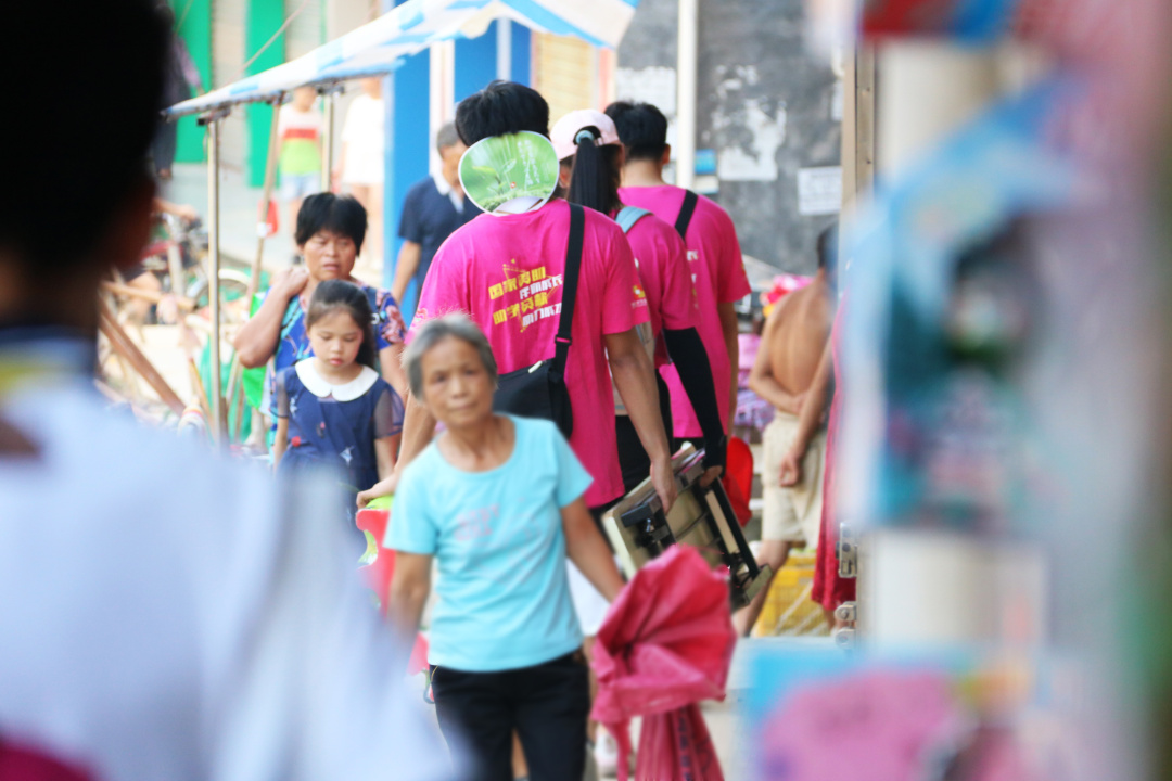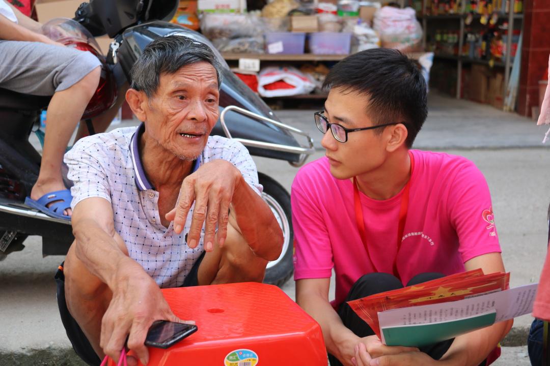 调研组分成了三个小分队,一队协助宣传组在马头镇综合市场进行国家政策宣传摆摊,一队前往张田坑村协助义教组进行今日的义教活动,另一队对新丰县驻湖塘村温干部进行了访谈。