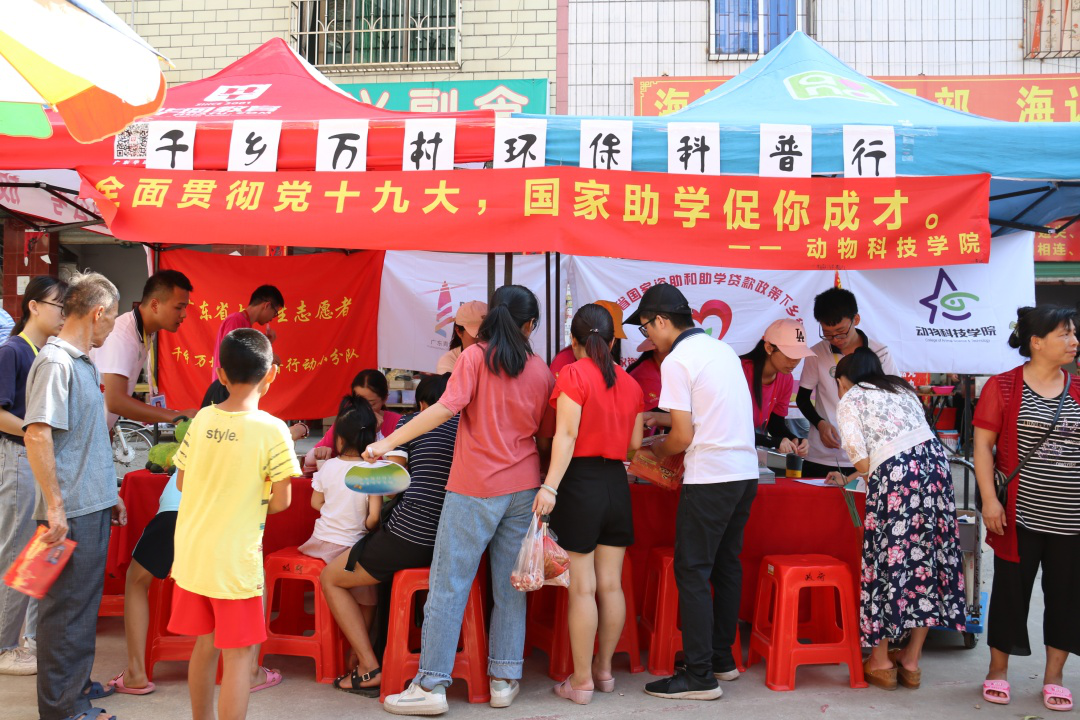 摊位上供孩子游玩的小游戏吸引来许多过往的孩子,且许多村民驻足观望,组员们积极且热情地为过往的村民宣传关于十九大精神、保护生物多样性的相关内容,并向他们讲解了关于“广东省国家助学贷款”的相关政策,并引导其完成调查问卷。
