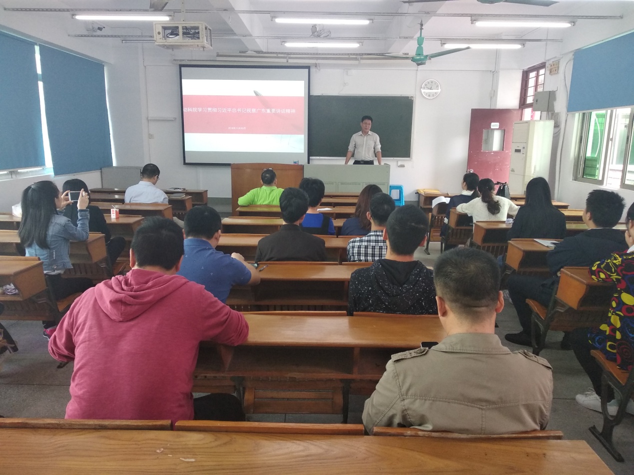 2018年11月30日上午,国产激情在线党总支书记欧坚泉在海珠校区教学楼605为国产激情在线全体教工党员做了《动科院学习贯彻习近平总书记视察广东重要讲话精神》的专题讲座。