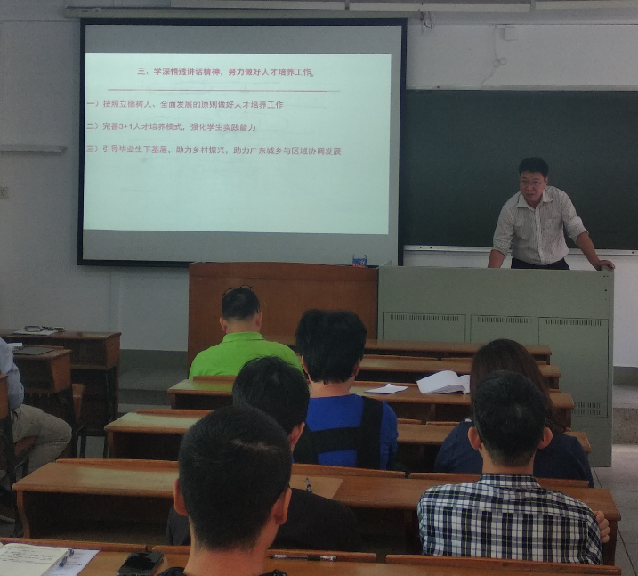 欧坚泉以习近平总书记在广东的行程为脉络,对习近平总书记视察广东的主要情况和发表的重要讲话精神进行了介绍。他表示习近平总书记系列重要讲话充分体现了习近平总书记对广东工作的高度重视和大力支持,对广东人民的亲切关怀,为广东新时代改革开放再出发进一步指明了前进方向、提供了根本遵循。他号召全体党员干部深入学习、深刻领会习近平总书记对广东的期望与要求,进一步提高政治站位,强化政治担当,把总书记对广东、广州的新任务新要求,作为推进学院教育事业发展的根本出发点,一是按照立德树人,全面发展的原则做好人才培养工作;二是完善“3+1”人才培养模式,强化学生实践能力;三是引导毕业生下基层,助力乡村振兴,助力广东城乡与区域协调发展。