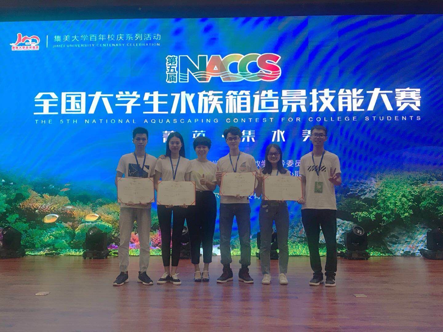 2018年10月12日至15日,第五届全国大学生水族箱造景技能大赛在厦门集美大学举行,国产激情在线周萌老师指导的5名学生组成的4个代表队在比赛中获得二等级3项、三等奖1项的优异成绩,在大赛的四个项目均有获奖。
