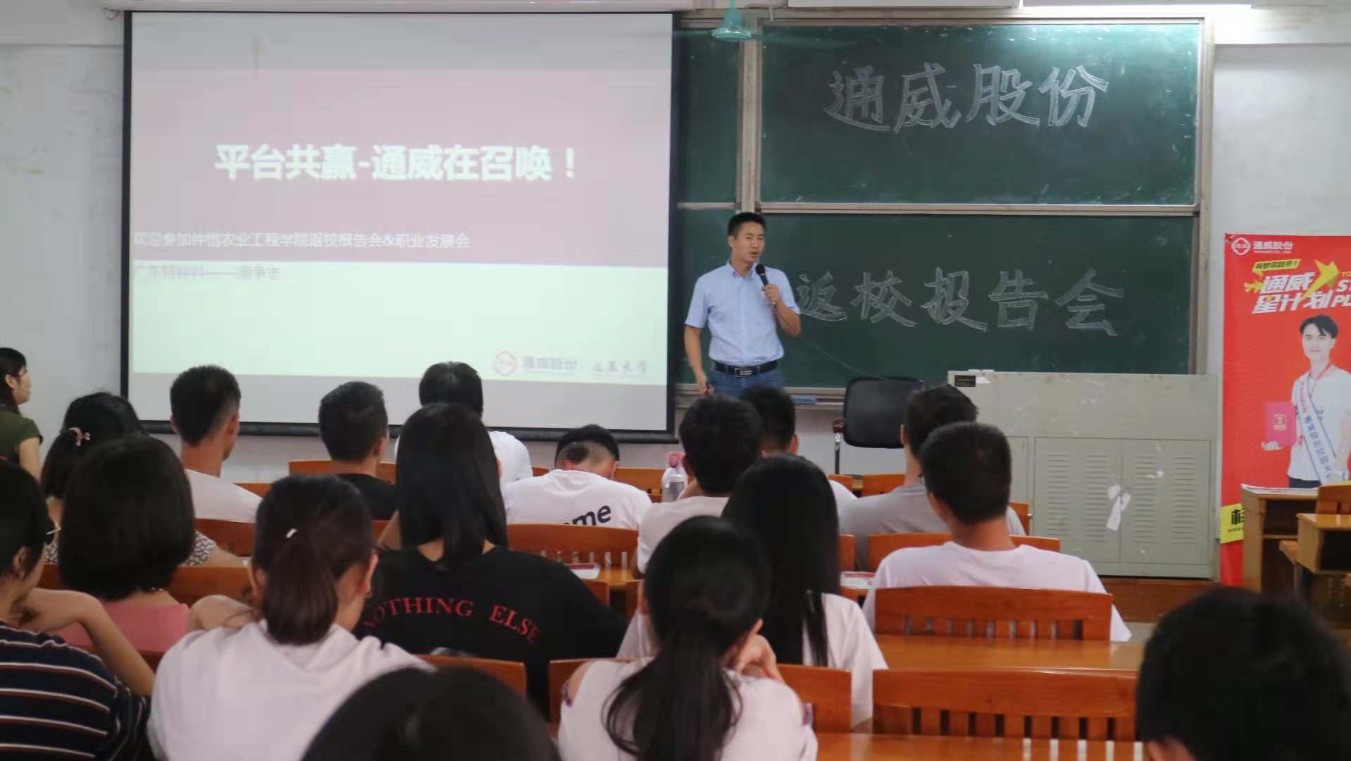 报告会首先通过宣传视频展示了集团的企业文化和行业发展态势,激发同学们的热情,提高了同学们对行业发展的认识。随后,曾参与通威“星”计划夏令营的动科学子水产153杨友成和水产152李丽佳上台发言,畅谈他们夏令营的生活经历,分享自己的心得与经验,引发在场同学的好奇心。现场同学们纷纷表示想要参加类似的社会实践活动。最后,广东通威特种料营销总经理周争志对集团的基本概况、工作环境、发展现状与规划、员工的晋升与发展等方面进行了详细介绍。同时他还积极与学生互动,分享了自己的职业经历,结合工作中的丰富实践,引导学生在学业上找准自己努力的方向,关注行业发展,做一名有当担、有想法、有梦想的青年。