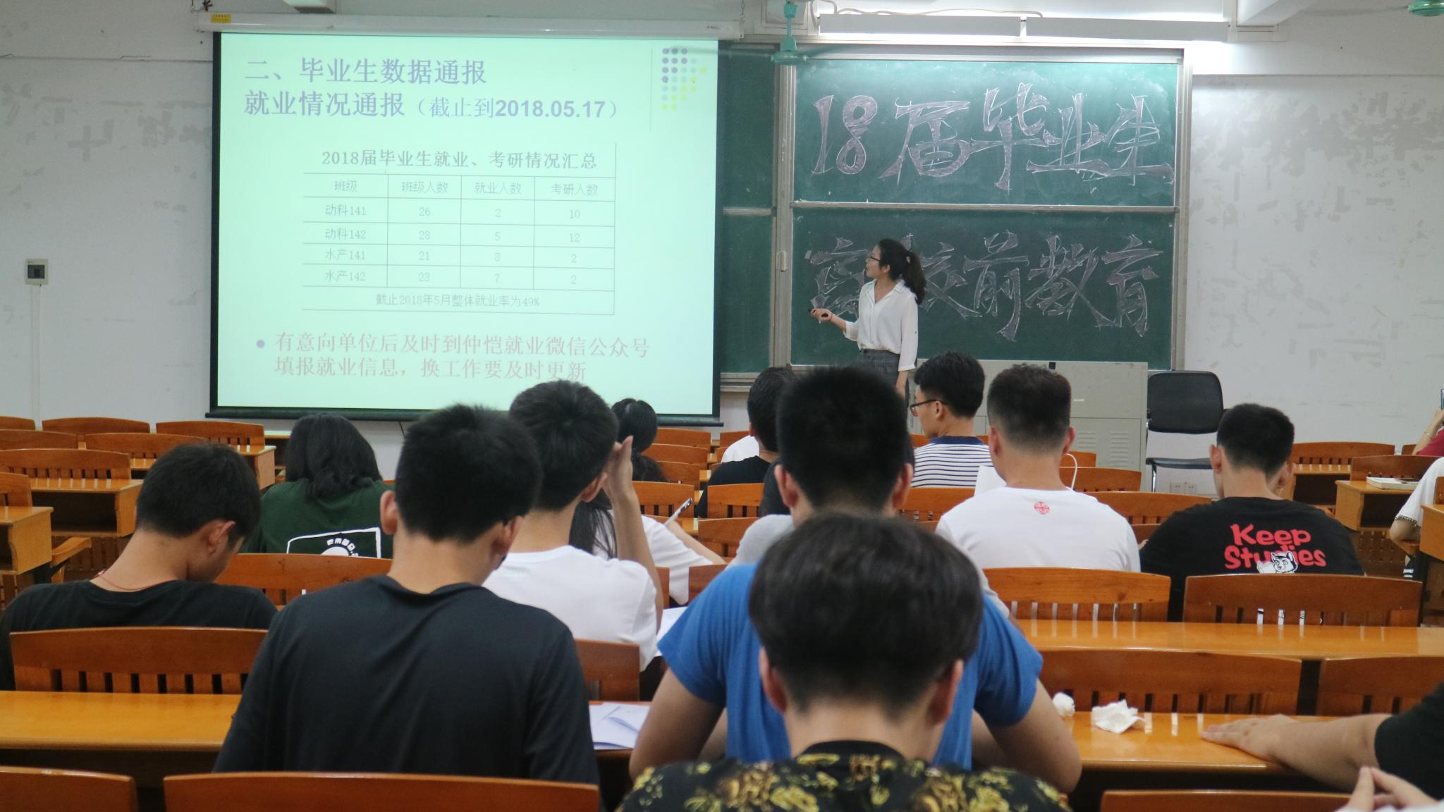 许鸿老师的简单自我介绍后会议正式开始。本次会议包括信息发布渠道、毕业生数据通报、毕业前代办事项、毕业后注意事项以及多渠道就业五大内容。许鸿老师讲述信息发布渠道主要通过仲恺动科院2018届毕业群专门发通知;还对2018届毕业生就业、考研的情况进行了汇总。其中在毕业前待办事项中,许鸿老师除了讲如何进行就业信息的填报外还着重介绍劳动合同法相关法规及签订劳动合同的注意事项,她希望同学们能够对劳动合同法有一定了解,签署合同前要确认合同表述是否严谨等相关问题。许鸿老师强调了派遣信息的填报和截止时间、毕业生档案去向等相关问题,期间还讲到了国家助学贷款的一些基本常识、还款流程、注意事项和毕业生诚信还款相关条约。