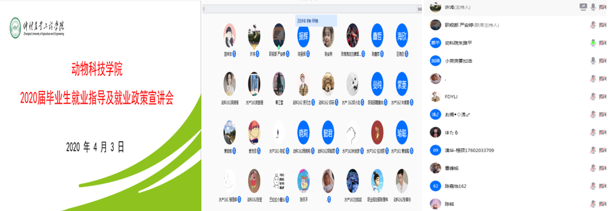 针对疫情情况,为进一步推进我院毕业生的就业工作,充分调动学生就业的积极性,帮助学生认清就业形势,准确定位,科学规划职业生涯,2020年4月3日我院通过腾讯会议组织开展了2020届毕业生就业动员大会,出席本次会议有国产激情在线党总支副书记朱路平、辅导员许鸿、李博,往届毕业生水产14级程硕和动科15级何炳健以及全体2016级毕业生。会议由国产激情在线辅导员许鸿主持。