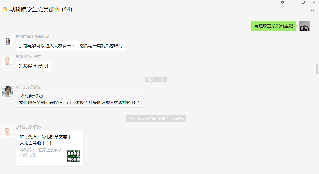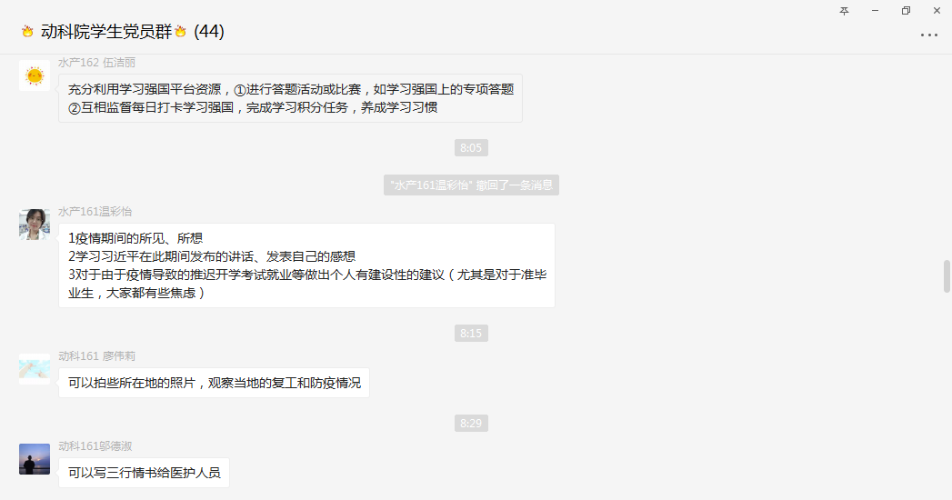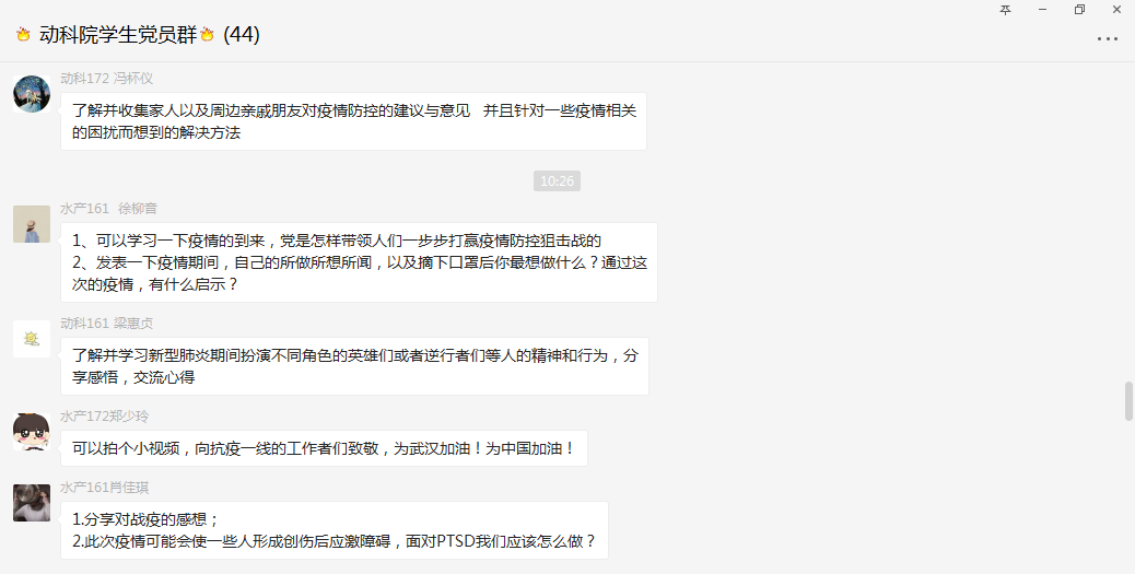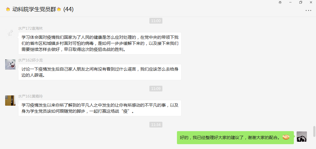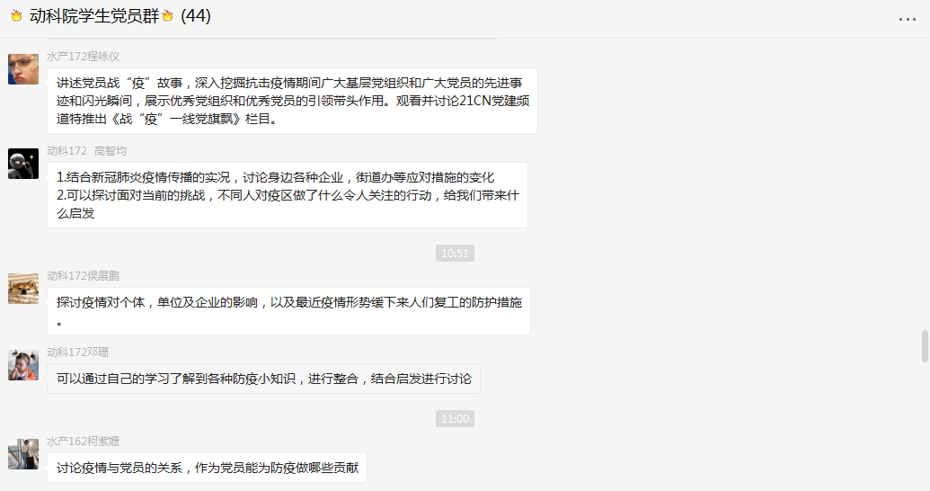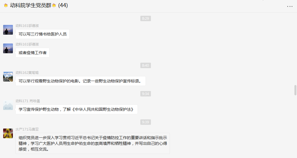 会上,林婉静同志首先发布了讨论的话题。许鸿首先带头发言,提出针对此次的疫情防控,党支部应积极利用网络平台开展工作,可以举办新型冠状病毒防控知识竞赛或通过视频进行演讲比赛。她强调作为党员要有所作为,发挥积极带头作用。接着,各位党员积极发言。邬德淑同志发言说可以给医护人员或疫情工作者写三行情书,表达自己的情感;黄瑜瑜同志提出建议说可以举行观看野生动物保护的电影,记录一些野生动物保护宣传标语,贴切我们的专业也能提高爱护动物的意识;郑少玲同志提议说拍摄小视频,向抗疫一线的工作者们致敬,为武汉加油!为中国加油!