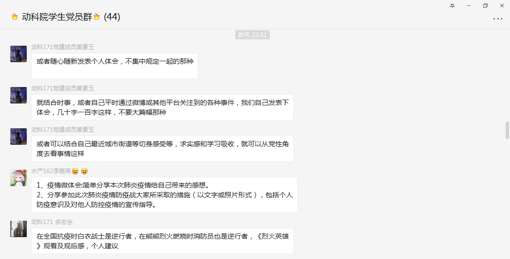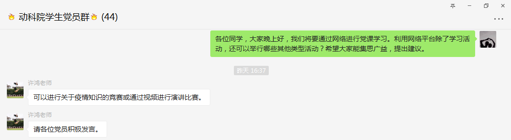 2020年2月25日,为积极响应“停课不停学,线上开展教学及学习”的工作,国产激情在线学生党支部利用微信群开展主题为“如何更好利用网络开展党建工作”的线上会议。国产激情在线学生党支部书记许鸿、全体学生党员参加会议,会议由林婉静主持。