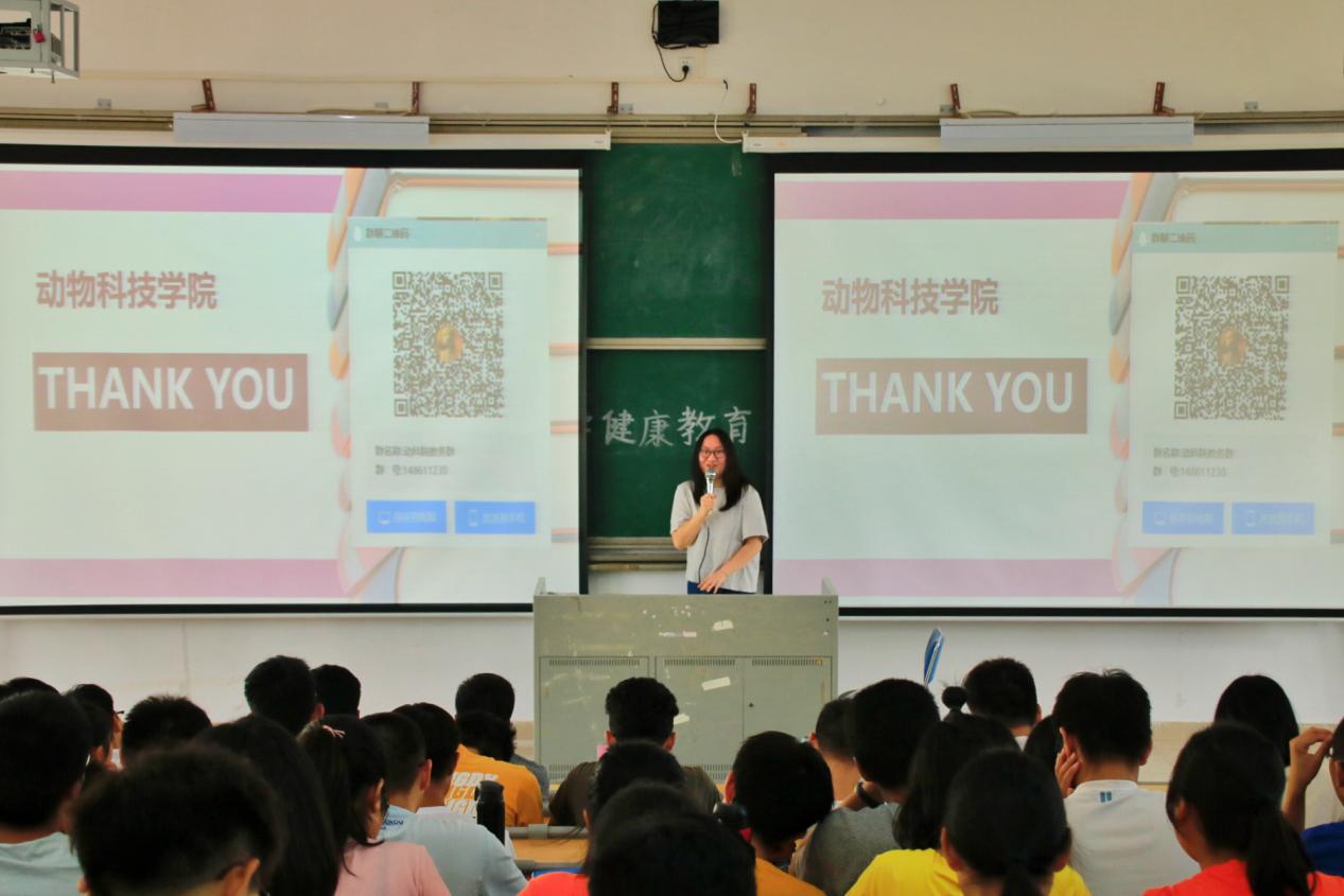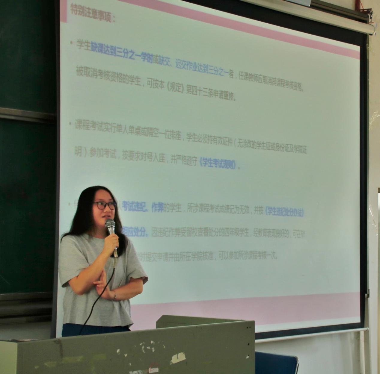 首先,麦老师简单地介绍了学校网址、教务处及教务管理系统相关网址,引导新生们学会如何使用教务网系统查找教学安排、考试安排、学生成绩、网上选课等教学信息。紧接着,麦老师详细地为新生们讲解了关于课程正选、补选、退选,考试缓考、补考、重修和修学分、学业警告、延长学习年限、退学的相关问题。她还特别强调学生缺课,迟交作业,考试违纪、作弊会受到相应处分等问题,并提醒新生认真阅读《学生手册》,遵守好各项规章制度。