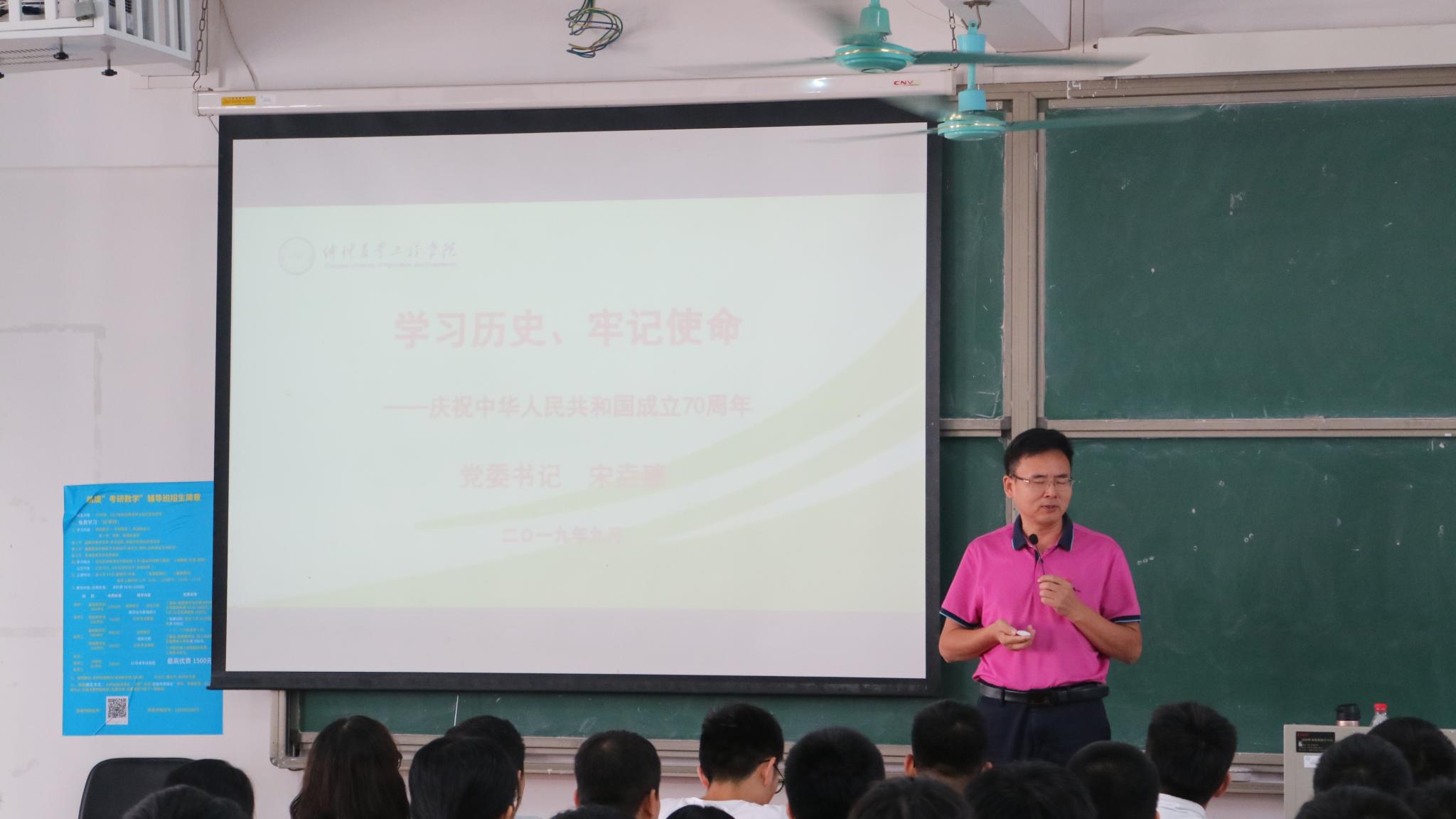 9月25日上午,学校党委书记宋垚臻以“学习历史,牢记使命”为主题,在白云校区杨钊杨勋楼402 为国产激情在线动科水产专业2018级学生讲授本学期第一堂思政课。