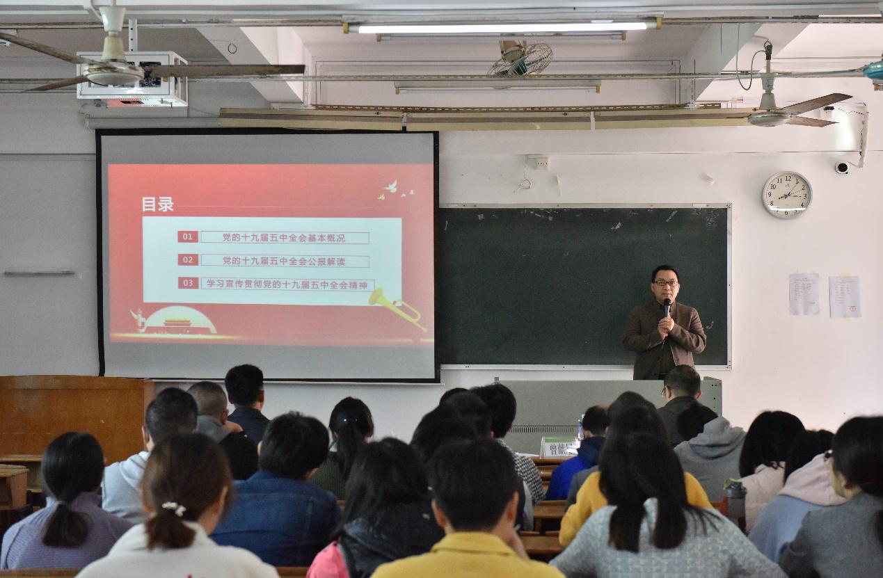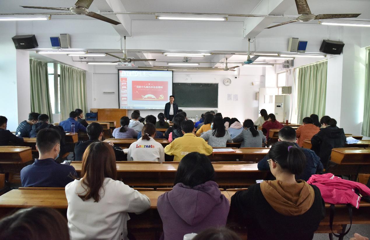 12月3日下午,国产激情在线在教学楼609组织学习党的十九届五中全会精神专题宣讲会,邀请学校党委宣传部部长曾献尼同志作“学习宣传贯彻党的十九届五中全会精神”学习辅导报告。国产激情在线全体教工及研究生参加会议,会议由党总支书记欧坚泉主持。