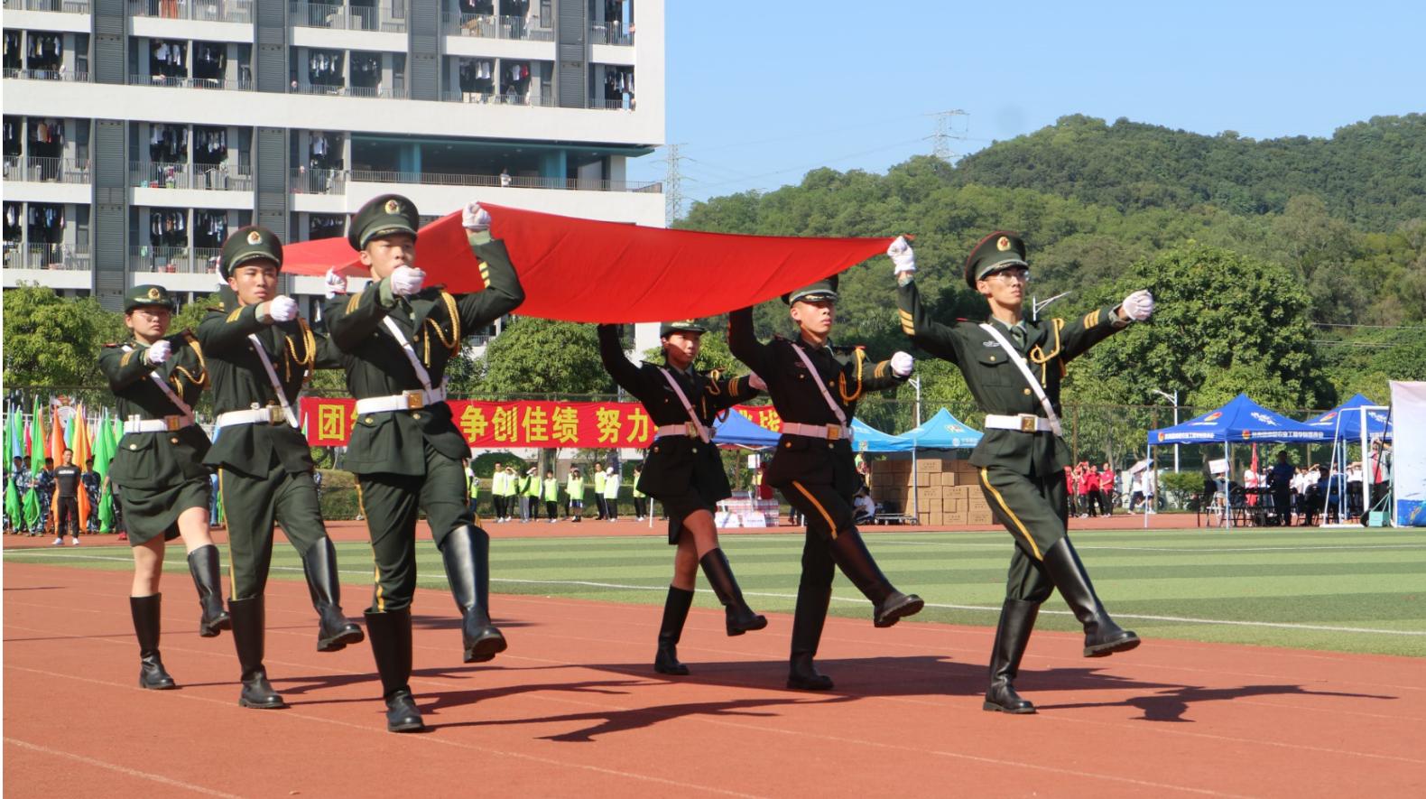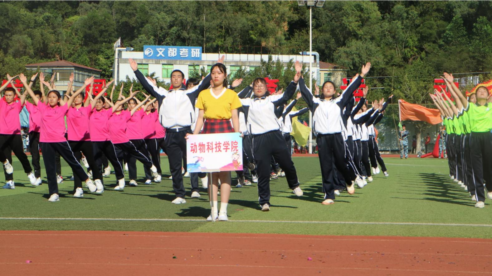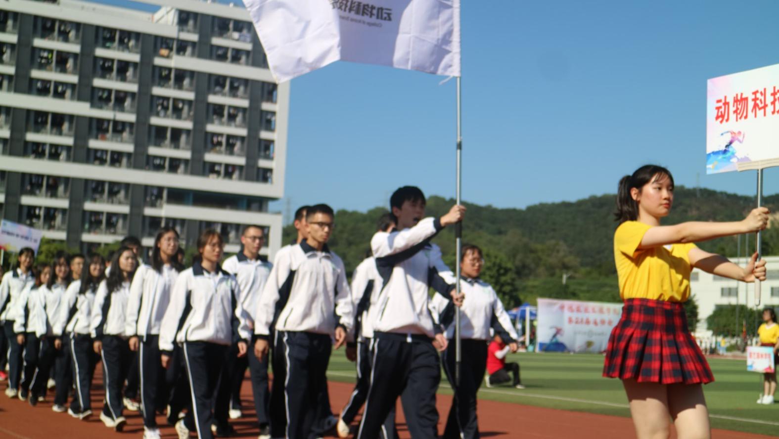 运动会开幕式的入场式中,我院方阵统一身着校服手持国旗,士气高昂地走过主席团,“动科出征、万物丛生”的口号响彻云端,充分展现出我院的专业特色和师生力争上游的信念。入场完毕后,校党委副书记李海燕对此次运动会致辞,希望同学们能够赛出成绩、赛出风采,并预祝校运会顺利进行。