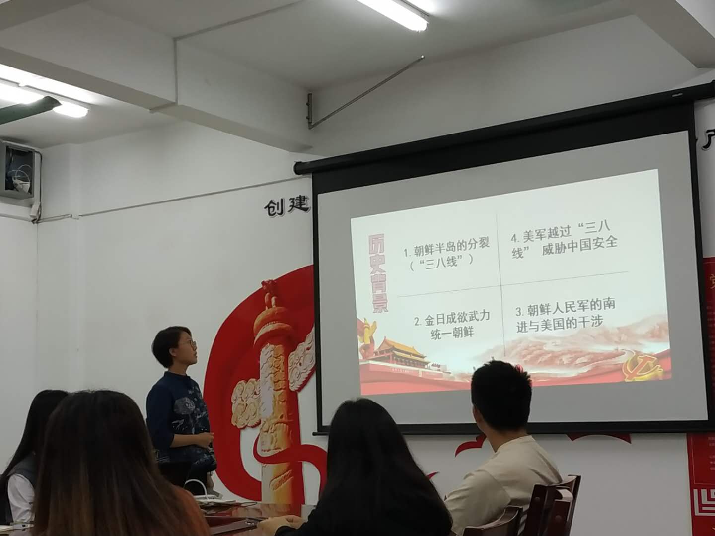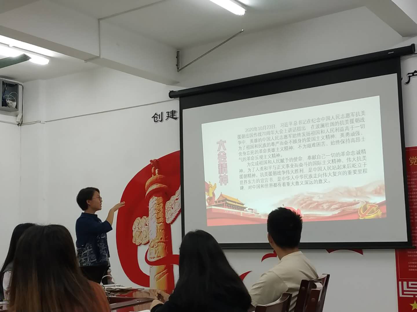 会上,颜旭言同志带领大家回顾了抗美援朝的战火历史,重点讲述了被称为“国魂之战”的上甘岭战役,以及在抗美援朝中涌现出来的英雄烈士。同时呼吁大家在和平年代不能忘了战火的无情,不能忘了那些为了换取国家安定、今日之繁荣昌盛而抛头颅洒热血的志愿军烈士。作为党员,要继承弘扬先辈们敢于牺牲自己,为了祖国和人民的利益牺牲一切的大无畏革命精神。