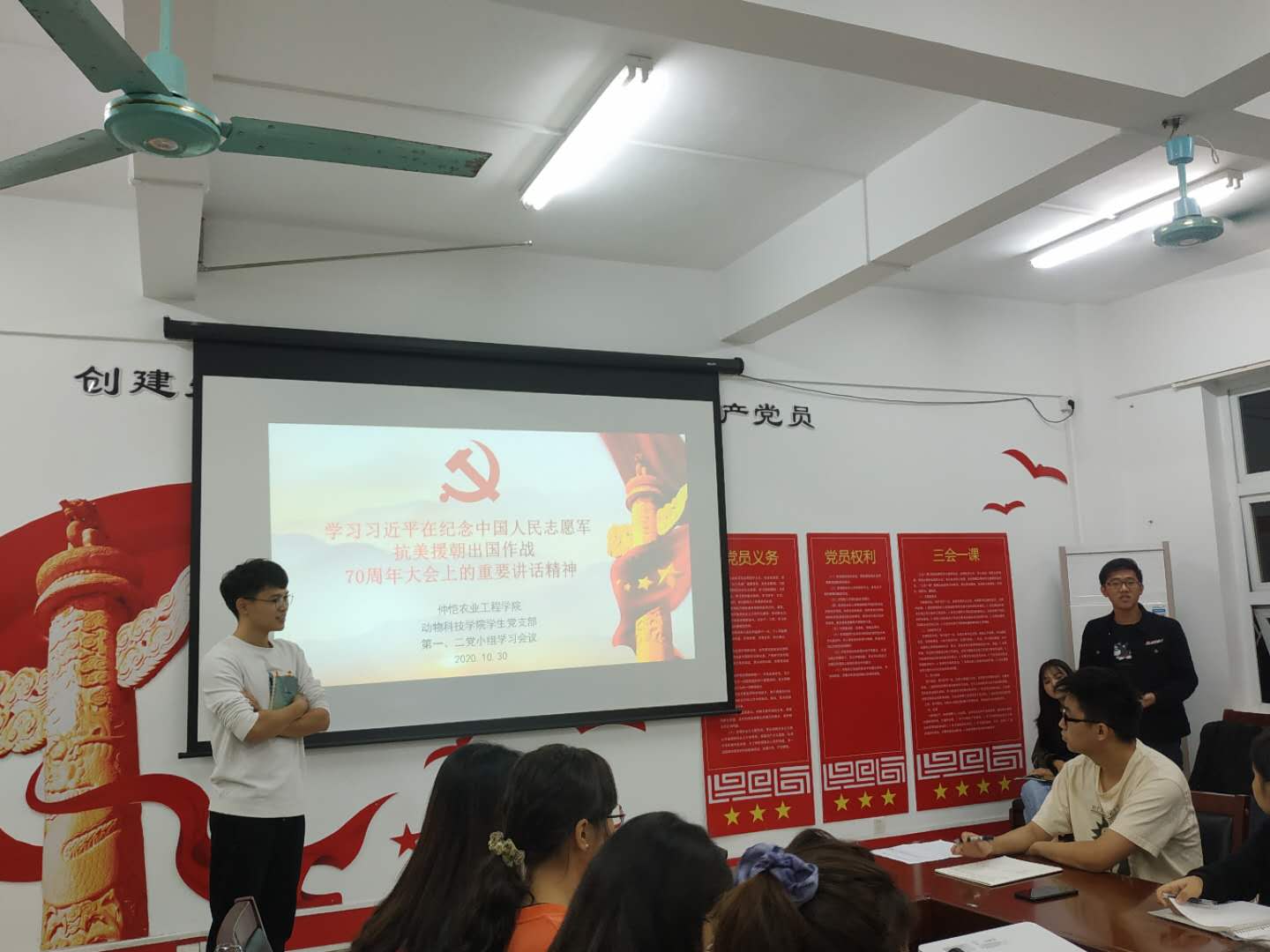 2020年10月30日晚,国产激情在线学生党支部在党员活动室314开展“学习习近平总书记在纪念抗美援朝作战70周年大会上的讲话精神”活动。会议由党员谭韬主持。