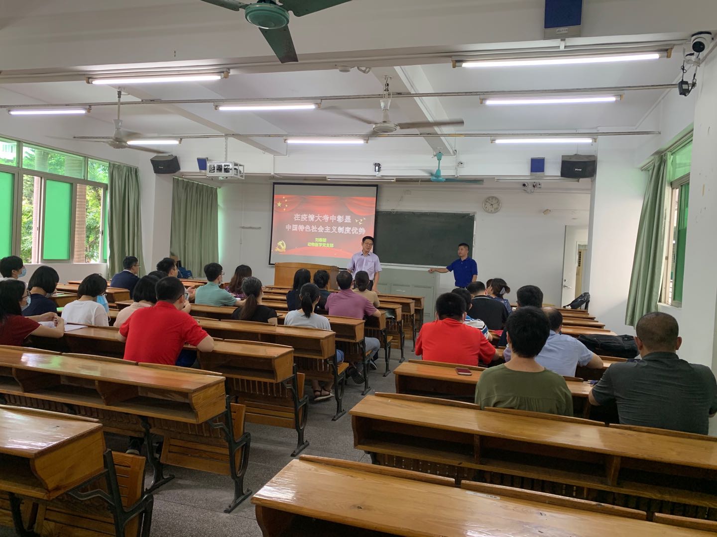 7月7日上午,国产激情在线党总支在教学楼208开展“党课开讲啦”活动。本次党课由动医系教工党支部书记刘春朋和学生党支部书记许鸿担任主讲人,国产激情在线全体教工党员参加党课,会议由党总支书记欧坚泉主持。