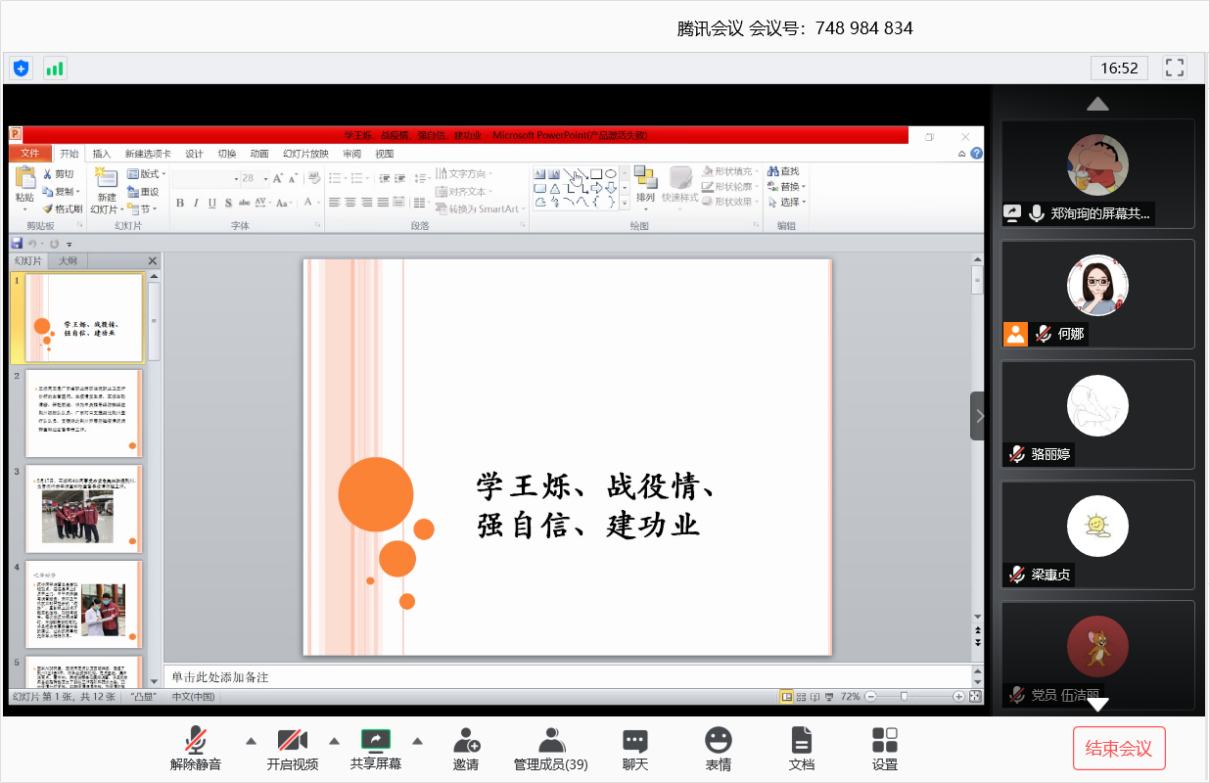 随后,党员代表梁惠贞,张穗玲,邱小龙等同志发表学习感想。王烁同志作为一名共产党员,起到了先锋模范作用。在疫情期间,他义无反顾地冲往一线,虽然因公殉职,但是他永远活在我们的心中。他用青春和生命践行着入党誓词,做为学生党员的我们,应该将王烁同志的精神传承下去。在疫情期间,我们也应该把时间和精力花在有意义的事情上,做好学生本分,努力学习真本事更好地为大家服务。