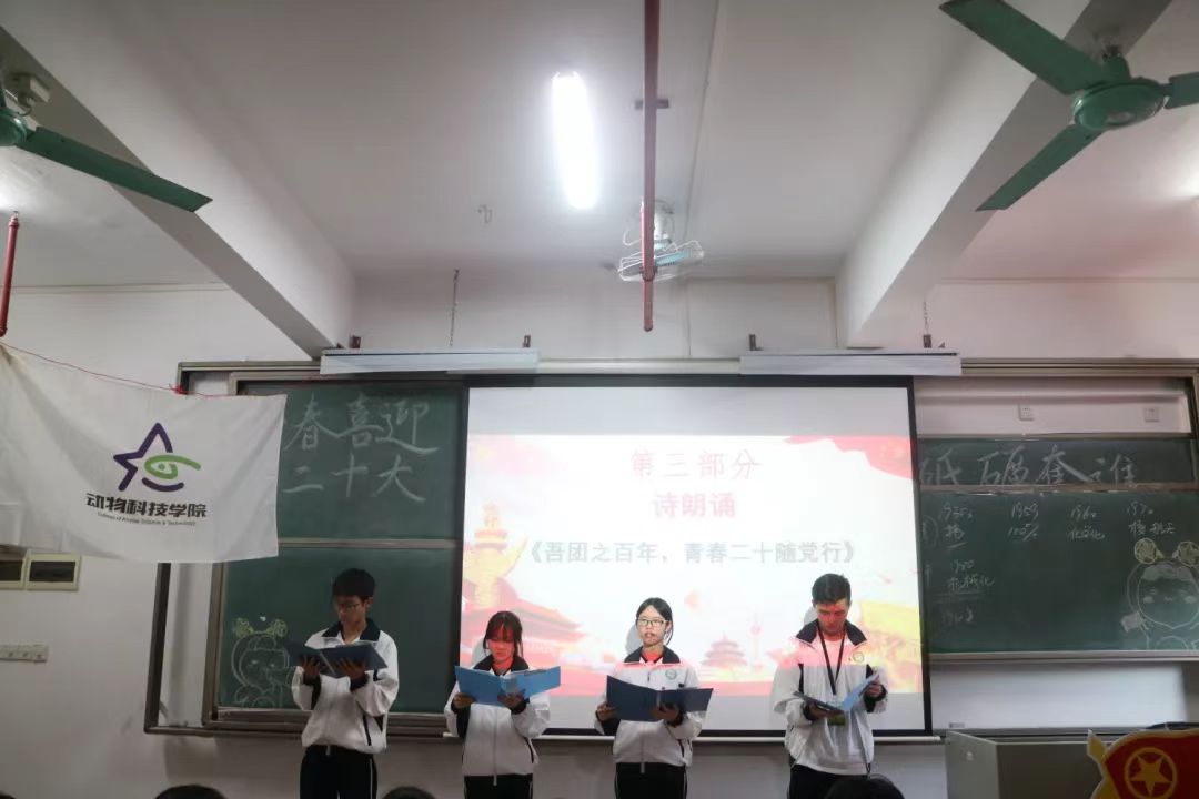 在中场休息时组织部为大家带来朗诵——《吾团之百年,青春二十随党行》,他们的朗诵铿锵有力,很快也积极调动起同学们的情绪。