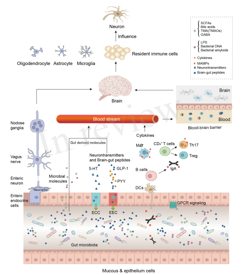 神经退行性疾病包括阿尔茨海默病、帕金森病、亨廷顿舞蹈症、多发性硬化症等。随着人口老龄化的增大,此类疾病的发病率明显提高,给社会经济和人民生活带来巨大影响。由于此类疾病病因复杂,病程不可逆,临床尚无有效的治疗手段,因此寻找有效的早期干预策略和手段十分重要。肠道微生物近年来被证明,不仅参与消化与吸收的过程,同时参与免疫、炎症、代谢、生长发育等众多生理过程。通过塑造和改变肠道微生物区系,有望为神经退行性疾病的预防和治疗提供新的思路。