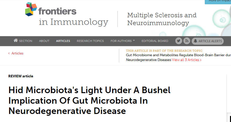 近日,以仲恺农业工程学院动物科技院本科生动科202班张浩铭为第一作者撰写的文章《Implication of Gut Microbiota In Neurodegenerative Disease》(肠道微生物与神经退行性疾病的关系)论文,被国际知名免疫学期刊《Frontiers in Immunology》收录,并在其网站发表,影响因子(Impact factor,IF)为7.561 ,JCR一区。这是目前为止,我校在读本科生发表的最高影响力的学术文章之一。本研究受到国家自然科学基金项目资助。