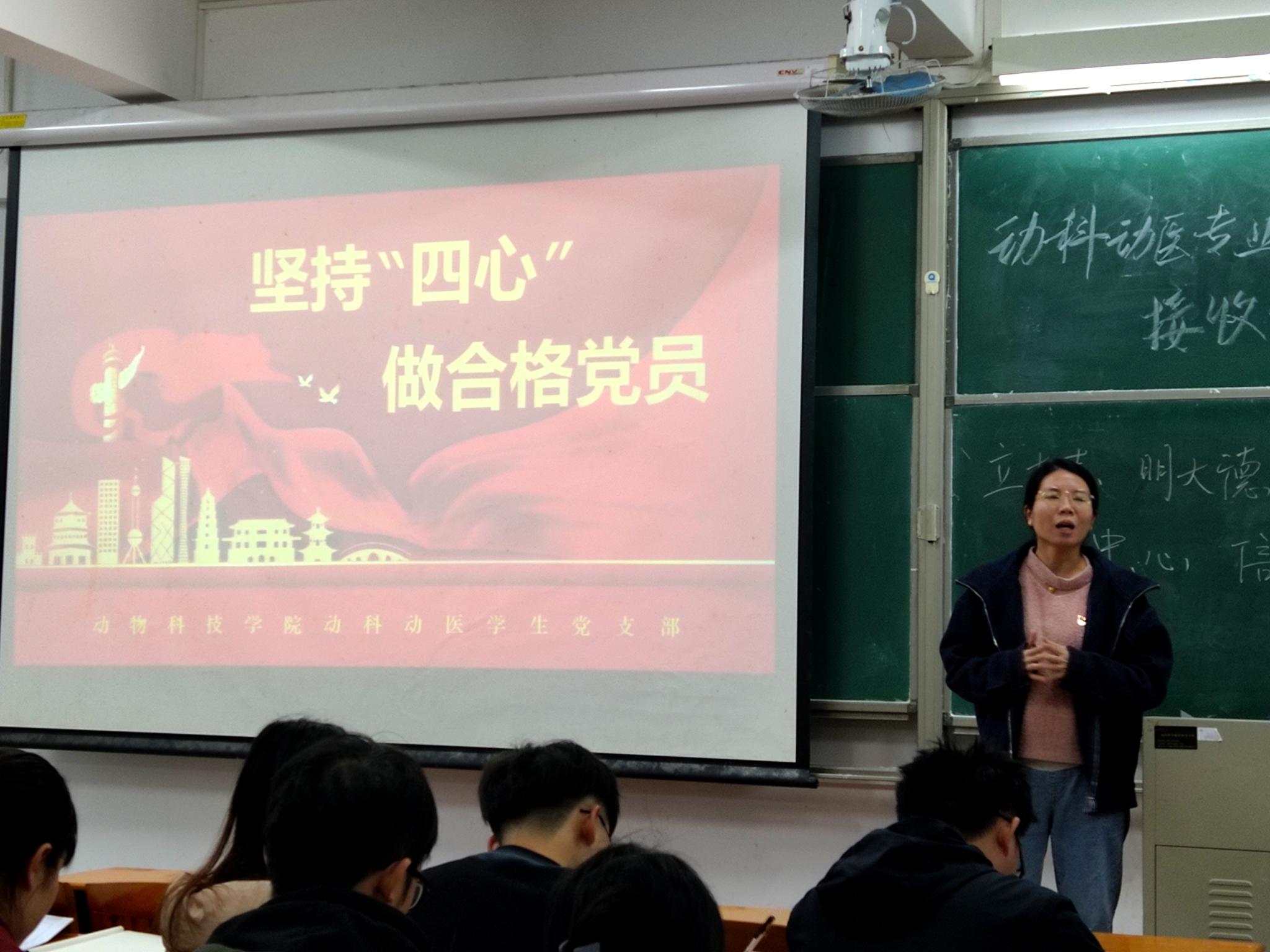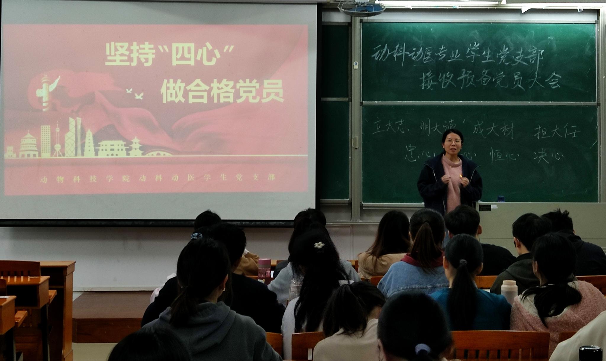 为进一步加强同学们的党性修养,国产激情在线动科动医学生党支部于12月3日下午三点在杨楼307开展了“坚持‘四心’,做一名合格党员”主题党课,由动科动医专业学生党支部书记许鸿主讲。国产激情在线动科动医专业学生党支部全体党员以及第六十五期国产激情在线发展对象参加学习活动。