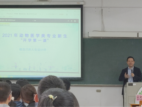 课上,李江副总裁就同学未来的就业方向、目前人生阶段性差异变化所面临的问题、专业所在行业的机遇与变化给新生提出了建议和指导。他提到努力的程度决定未来的高度,现阶段的同学们需注重培养自主学习能力、责任心与团结协作的精神,积极扩展各方面的兴趣爱好,争取努力成为综合性人才。并强调宠物医生行业随着中国经济的快速增长驶入了高速发展的快车道,同学们需要把握好专业优势,奋发努力,以求不断完善提升自己。