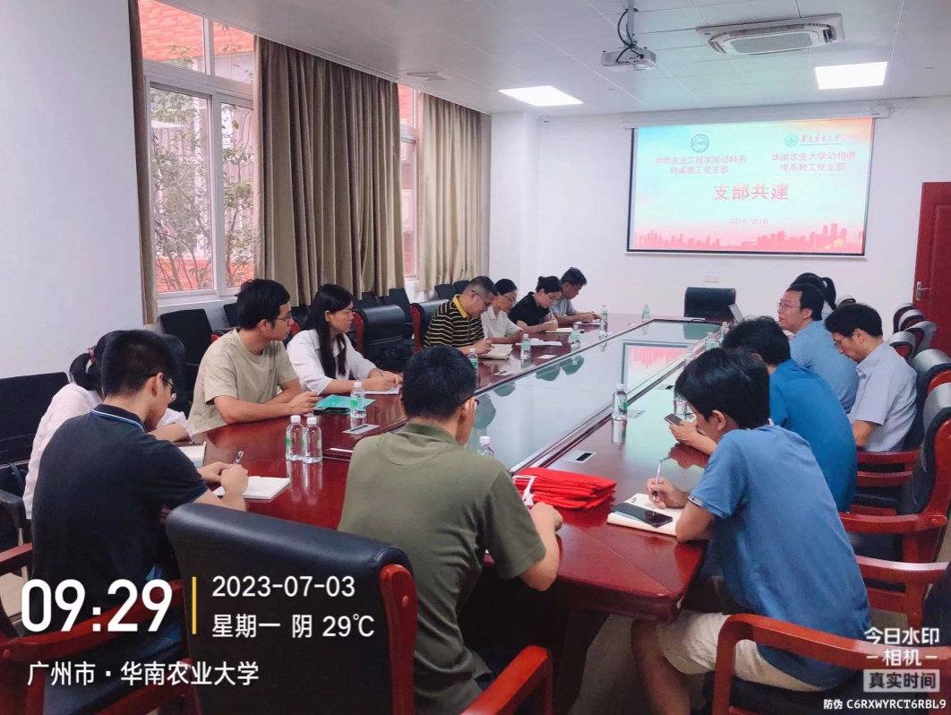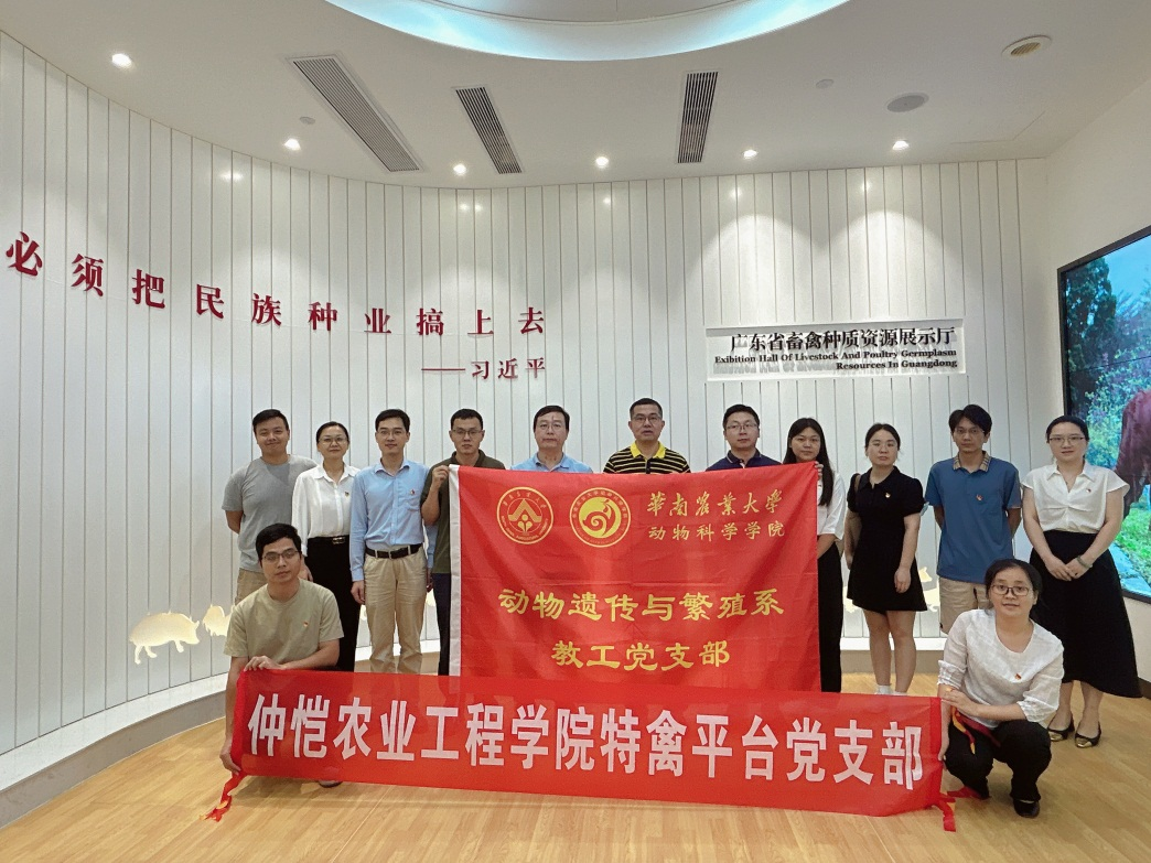 为扎实推进学习贯彻习近平新时代中国特色社会主义思想主题教育走深走实,充分发挥基层党组织的核心引领作用,推动党建工作和业务工作深度融合,7月3日,国产激情在线特禽平台教工党支部党员前往华南农业大学,与华南农业大学国产激情在线动物遗传与繁殖系教工党支部开展党支部共建活动。特禽平台教工党支部书记黄运茂教授、动物遗传与繁殖系教工党支部书记张哲教授、支部委员及部分党员同志参加此次共建活动。