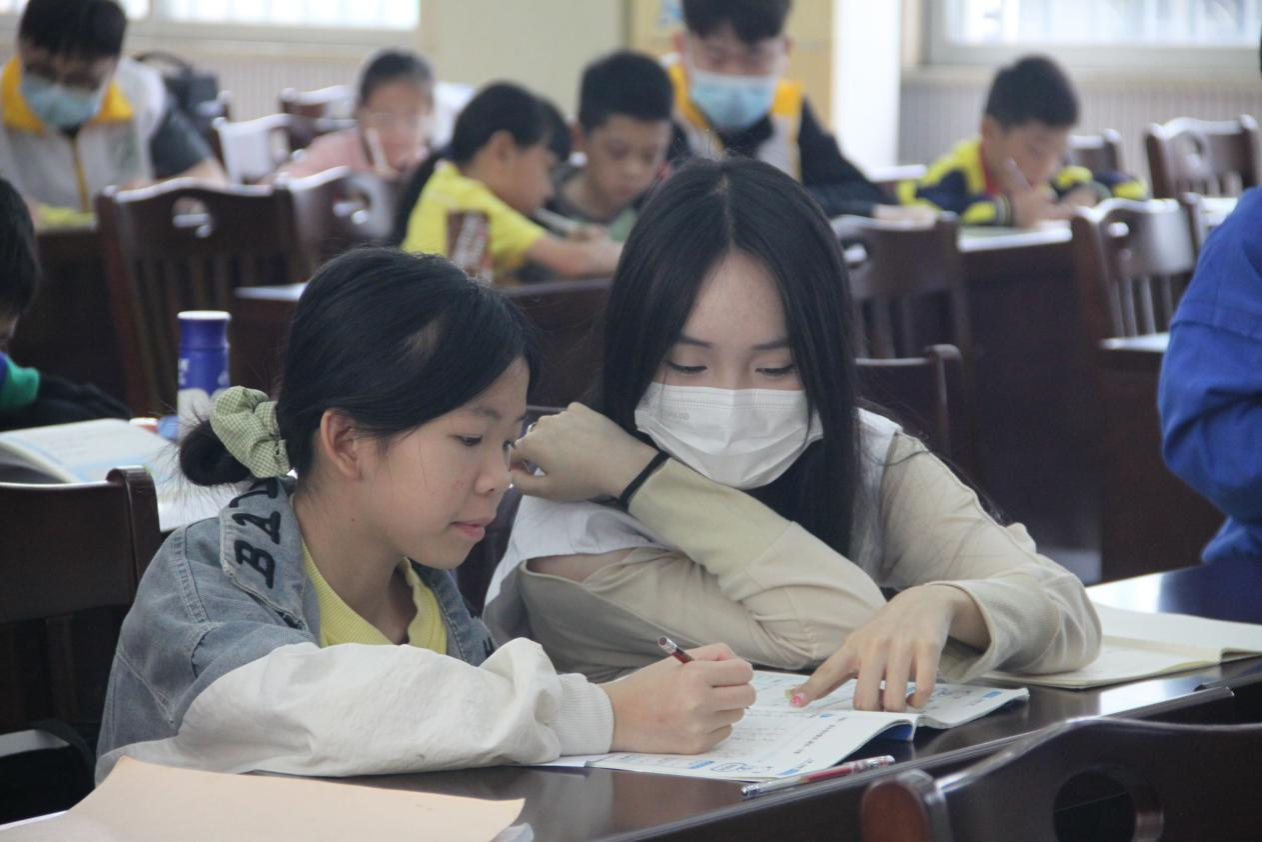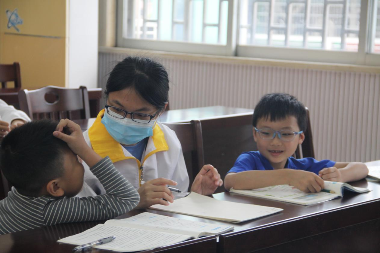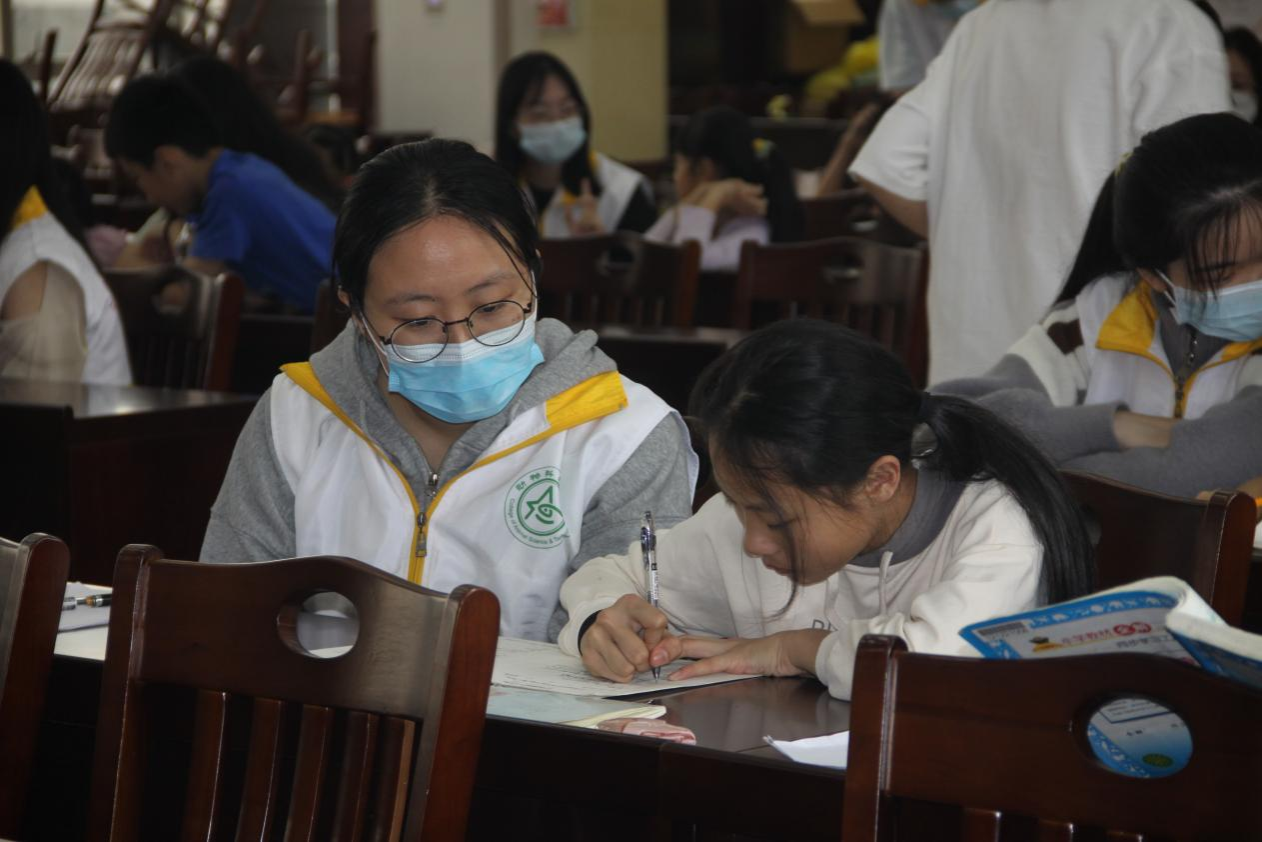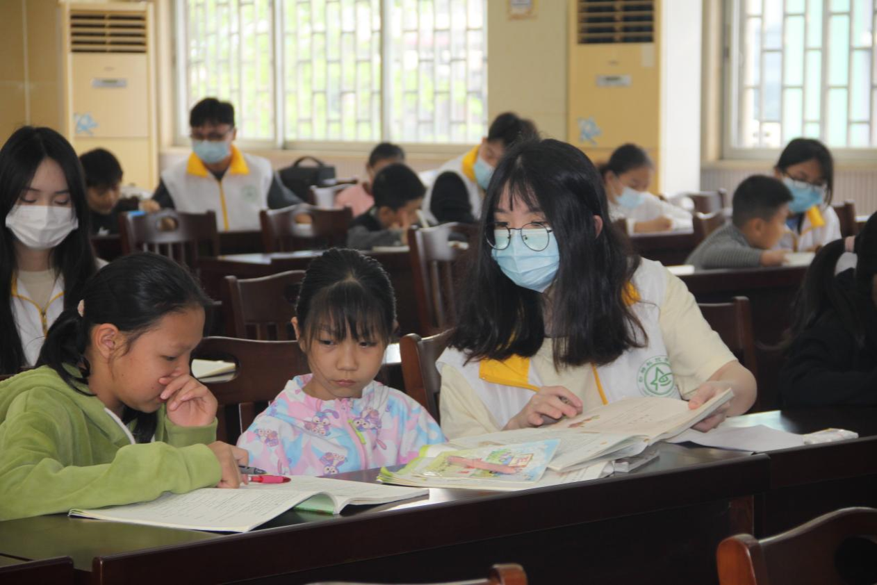 首先进行的是小朋友们的作业辅导。志愿者们帮小朋友们排好座位后,便穿行在小朋友们之间。每当小朋友们提出问题,志愿者们都能顺利帮助他们思考并解决问题。在志愿者们的帮助下,小朋友们都顺利地完成了自己的作业。