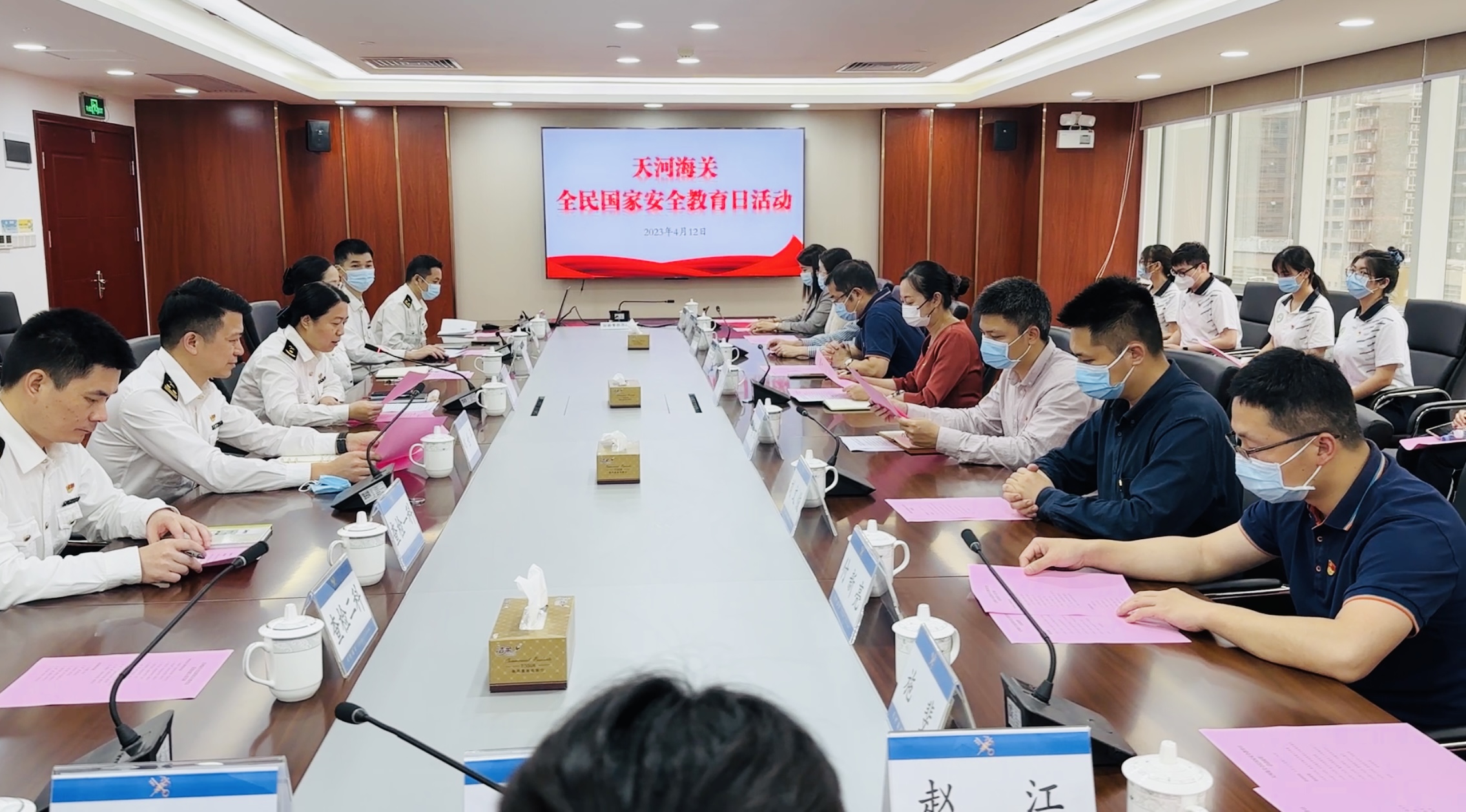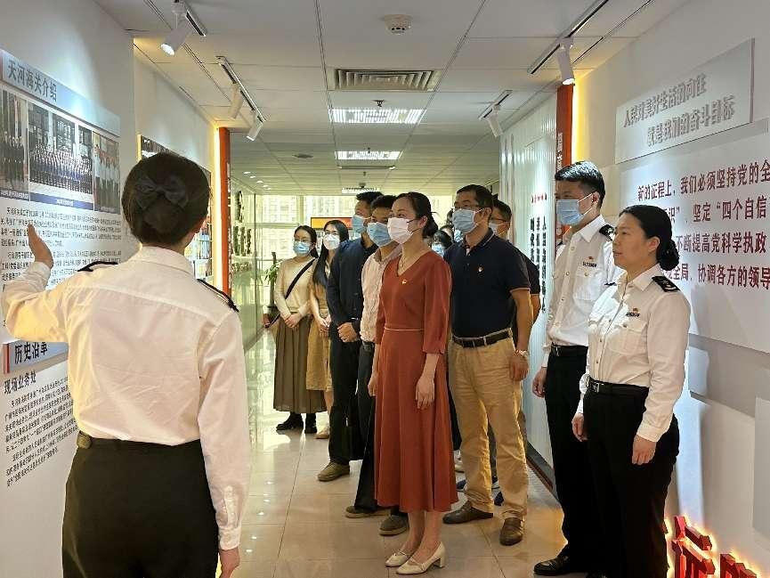 为学习贯彻党的二十大精神,充分发挥基层党组织的核心引领作用,激发“三会一课”新活力,推动党建工作和业务工作深度融合,4月12日,国产激情在线党委书记朱路平、党委副书记李昌辉、副院长黄运茂、刘文俊和党支部书记、党员代表一行前往天河海关开展党建结对共建暨全民国家安全教育日交流活动。天河海关关长王丽霞、副关长李娟、郑世平以及各科室负责人出席活动。
