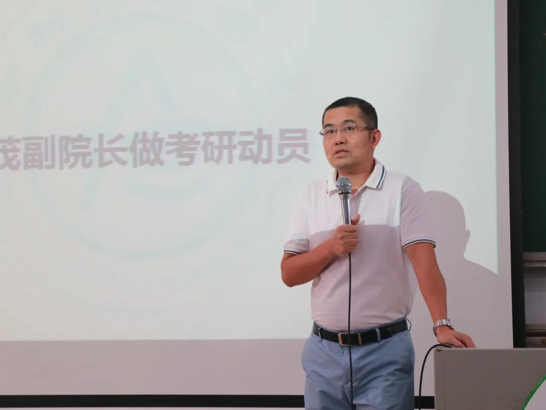其次黄运茂进行考研动员,他以往届插班生成功上岸的事例来鼓励同学们,希望同学们提升综合素质,做一个有想法和有理想的人。他提出了几点建议:一是要注重师生交流;二是要寻找良师,为今后的考研、考博打好基础;三是尽早确立考研目标,做好自身规划。他还以自身经验告诫同学们:切勿死读书,要学会借鉴他人好的学习方法。最后他祝愿同学们能够成功上岸,实现飞跃。