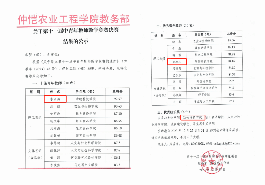 12月14日,仲恺农业工程学院第十一届中青年教师教学竞赛决赛在白云校区学术报告厅顺利举行,经过激烈角逐,我院教师李江涛斩获十佳青年教师,李冰心斩获优秀青年教师,国产激情在线荣获优秀组织奖。