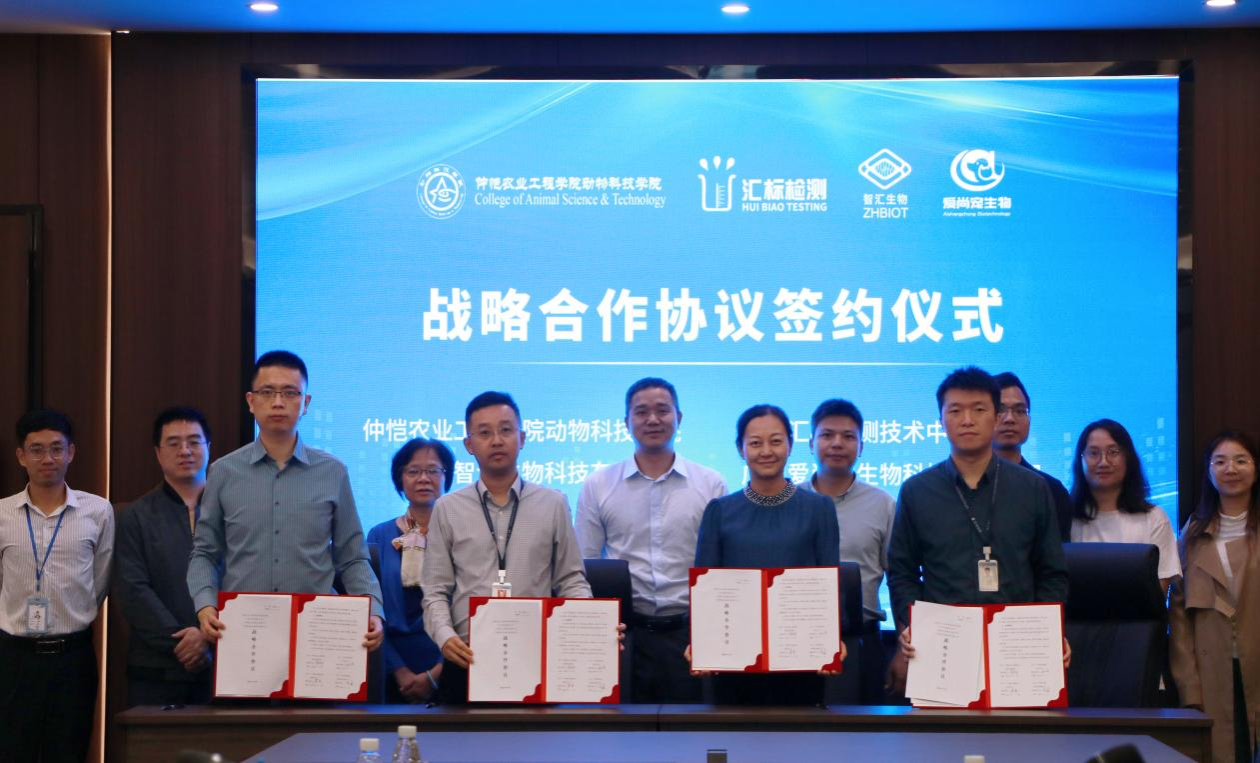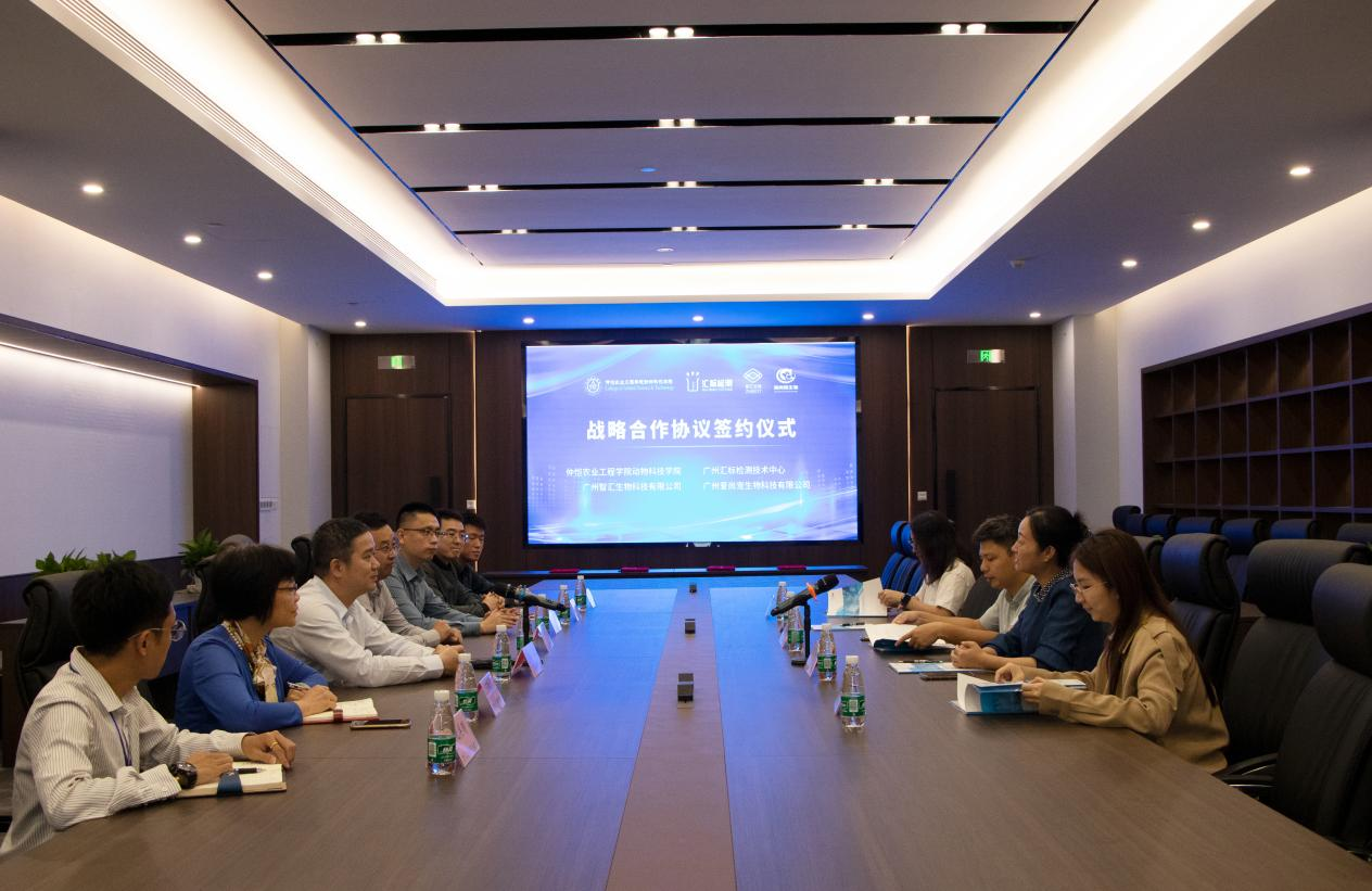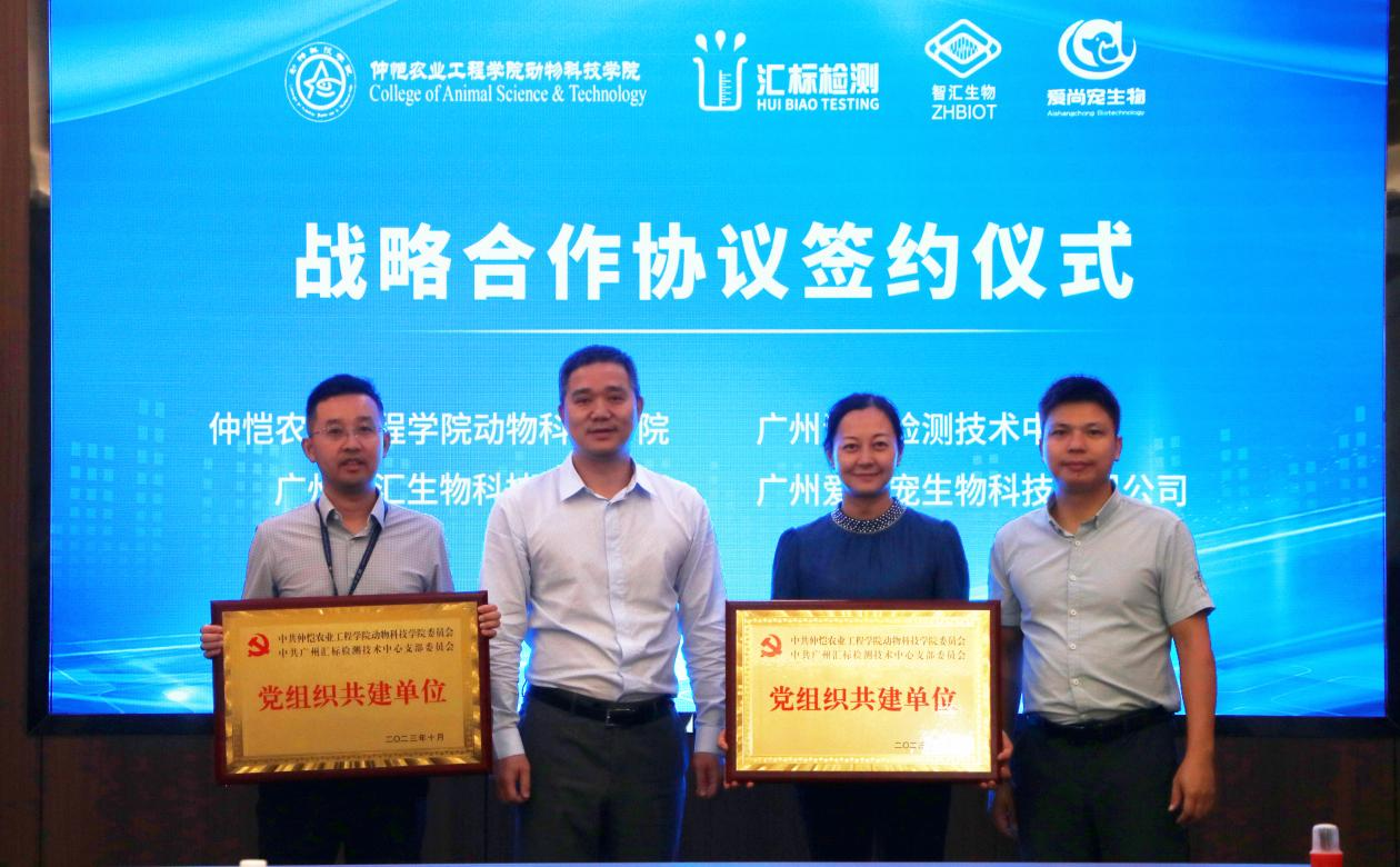 朱路平代表国产激情在线与广州汇标检测技术中心、广州智汇生物科技有限公司、广州爱尚宠生物科技有限公司共同签署了战略合作协议,并与广州汇标检测技术中心党支部书记李丰互授“党组织共建单位”牌匾。