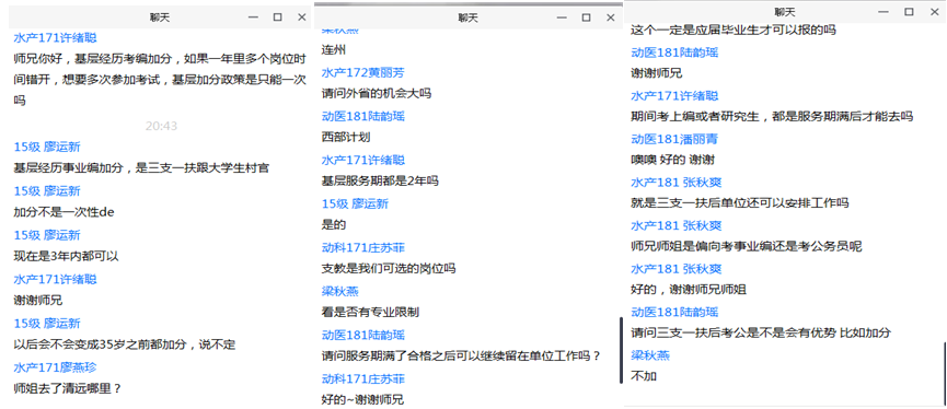 在经验分享环节,梁秋燕、廖运新分别从“三支一扶”的报名方式、自身的报名经验、招募流程、招募情况、薪资待遇、相关优惠政策及工作体验等方面为师弟师妹们作了详细的介绍分享,同时也鼓励师弟师妹加入基层工作,到祖国最需要的地方去,积极响应国家号召。在交流互动环节,同学们也纷纷就对“三支一扶”项目存在的疑惑进行提问,现场气氛热烈、秩序井然,梁秋燕、廖运新对于师弟师妹提出的问题均一一做了详细的解答。