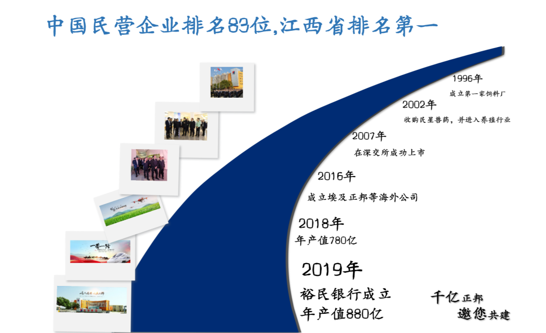 正邦集团创立于1996年,是农业产业化国家重点龙头企业,国家高新技术企业,旗下江西正邦科技股份有限公司为江西省民营企业首家上市公司。目前集团在全国29个省(市、自治区)拥有580家分(子)公司,在全球10个国家拥有15个投资项目,在职员工人数60000余名。2019年,正邦集团实现总产值880亿元,荣列2019中国企业500强247位、中国制造业500强第111位、中国民营企业500强第83位、中国江西民营企业500强第1 位。